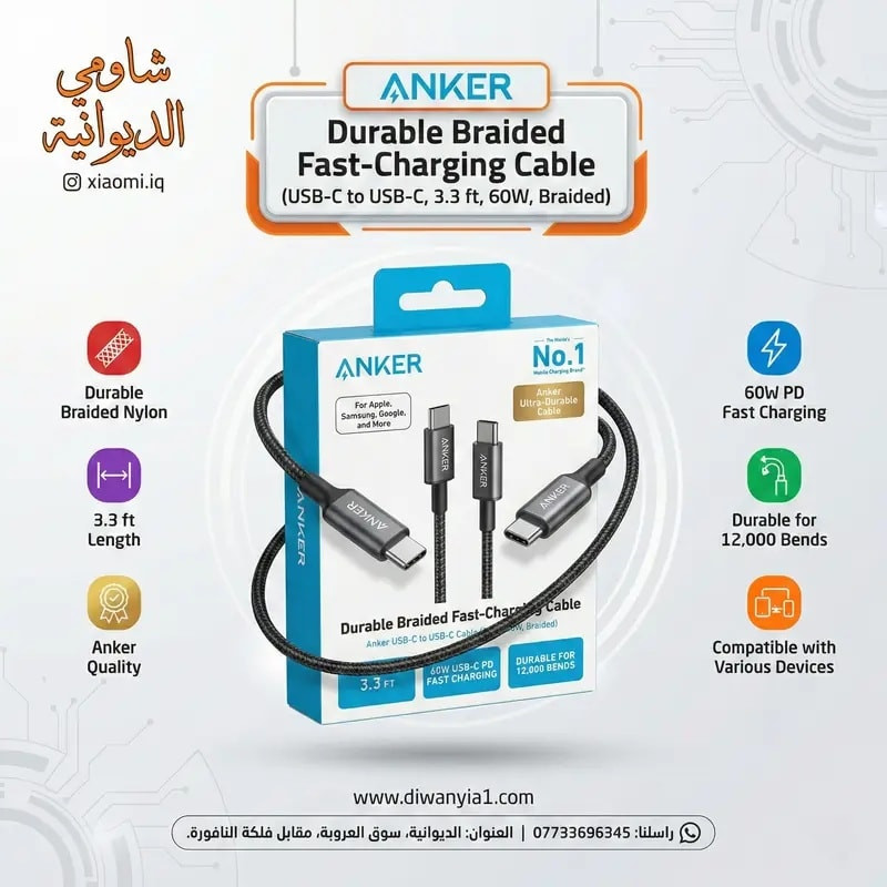 ANKER 60 WATT 7,000 د.ع الأصلي من Anker.. متانة عالية وسعر ما يتفوت! 🔥 جبتلكم اليوم الكيبل "الجوكر" من Anker، الماركة رقم 1 بالعالم بالشحن. هذا الكيبل يجمع كل المواصفات اللي تحتاجها باستخدامك اليومي وبسعر اقتصادي جداً: الكيبل يجي بمنفذ (Type-C to Type-C) ويدعم الشحن السريع بتقنية PD وبقوة 60 واط، يعني يشحن موبايلات آيفون (15/16) وسامسونج وكوكل وحتى الآيبادات بسرعة واستقرارية عالية تحافظ على بطارية جهازك. أما المتانة، فهذا الكيبل مصمم ليعيش وياك! مصنوع من خامة مضفرة (Braided) قوية جداً ومقاومة للقطع، وتم اختباره ليتحمل أكثر من 12,000 انحناء، يعني انسى أن الكيبل ينقطع أو يتلف من الاستخدام المتكرر. طول الكيبل (3.3 قدم / 1 متر) مناسب جداً للاستخدام اليومي. المنتج أصلي ومضمون (ستيكر عين الفهد). 💰 السعر: 7,000 دينار عراقي فقط 📍 العنوان: الديوانية - سوق العروبة - مقابل فلكة النافورة. 📞 للحجز والاستفسار راسلنا واتساب: *********** 🌐 موقعنا: www.diwanyia1.com #شاومي_الديوانية #Anker #شحن_سريع #كيبل_تايب_سي #اصلي #اكسسوارات_موبايل #الديوانية #TypeC