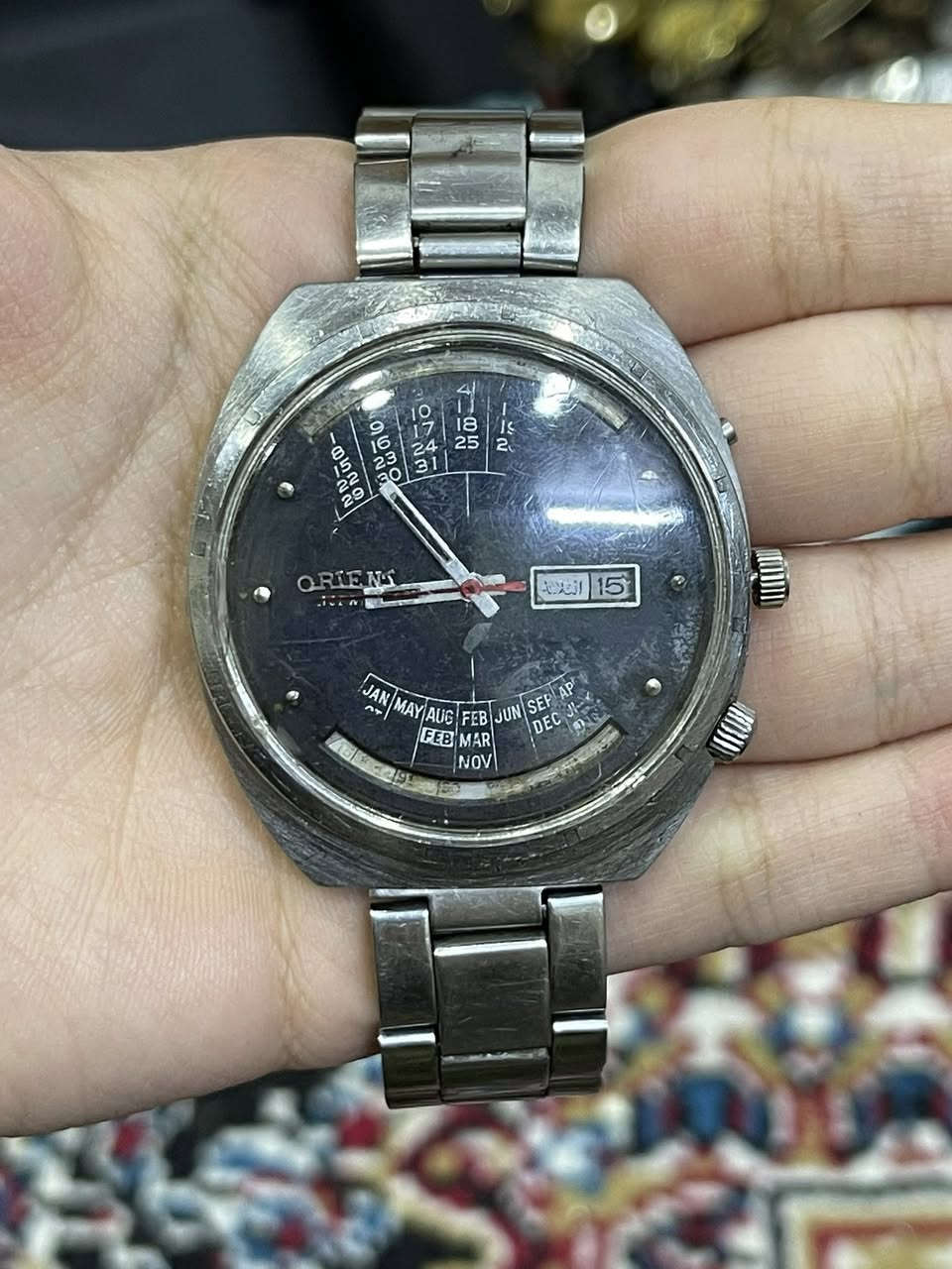 السلام عليكم ساعه Orient Perpetual وهي موديل كلاسيكي (Vintage) ياباني الصنع يشتهر بتصميمه الفريد الذي يظهر تقويماً لعدة سنوات على حركة أوتوماتيكية (Automatic)، وتأتي غالباً بـ 21 أو 27 حجراً (Jewels) حسب الإصدار. تحتوي على نافذة لعرض اليوم باللغتين العربية والإنجليزية وتاريخ الشهر. الهيكل: مصنوع من الفولاذ المقاوم للصدأ (Stainless Steel) بتصميم "البحاري" الشهير ذو الحجم الكبير. وصنعت في عام 1971 قديمه الصنع ملاحضه الساعه اصليه مع ختم بالمكينه وشغاله سعر ب200وبيها مجال **إذا كنت صاحب هذا الإعلان وتريد حذفه لأي سبب، رجاءا أرسل رسالة إلى الدعم الفني**