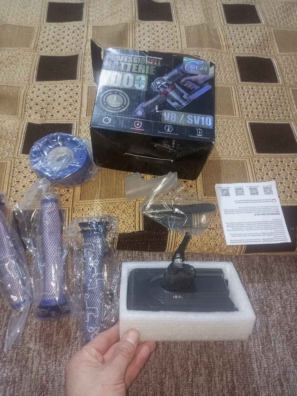 ذا المنتج عبارة عن بطارية بديلة وملحقات (فلاتر) لمكنسة دايسون اللاسلكية طراز V8/SV10. نوع المنتج: بطارية قابلة للشحن وفلاتر. التوافق: مصممة خصيصًا لسلسلة أجهزة Dyson V8، بما في ذلك طرازات SV10. السعة: تشير العبوة إلى سعة عالية تبلغ 7000 مللي أمبير في الساعة. الجهد: تعمل بجهد كهربائي 21.6 فولت. الميزات: تتضمن حماية مدمجة من الشحن الزائد والارتفاع في درجة الحرارة. دهوك, العراق **إذا كنت صاحب هذا الإعلان وتريد حذفه لأي سبب، رجاءا أرسل رسالة إلى الدعم الفني**