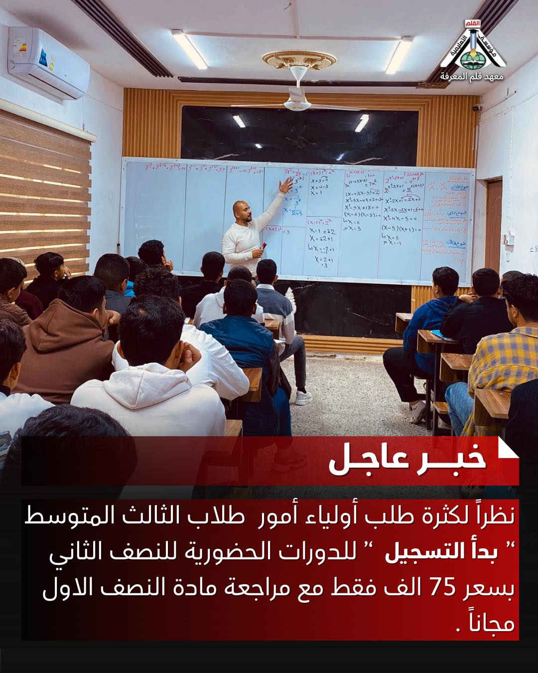 99% من الطلاب يقعون في الاختيار الخاطئ اختيارك الصح هنا…. نسبة النجاح العالية اكبر دليل 🫆 فتحنا التسجيل هسة للنصف الثاني بسعر 75الف بس والنصف الاول مجاني نبقة وياك لحد ليلة الامتحان سجل هسة و راح تشوف الفرق معهد قلم المعرفة التعليمي العنوان : بابل / الحصوة - حي الانتصار الشارع الاخير *********** إعلام متوسطة الشُكر للبنات-بابل أعدادية صنعاء للبنين /النشاط الرياضي والمدرسي متوسطة العدل للبنين ثانوية مصطفى جواد للبنات ثانوية سعد بن ابي وقاص اعلام متوسطة البلاغ المبين إعدادية صنعاء للبنين اعلام اعدادية قرطبة للبنات اعدادية الاسكندرية للبنين