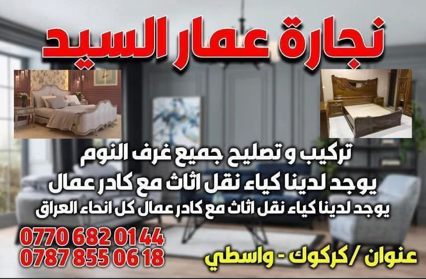 نجار متنقل داخل كركوك لفتح وشد وتصليح كافه أنواع نجار متنقل داخل كركوك لفتح وشد وتصليح كافه أنواع الأثاث *********** كادر نقل اثاث وتحويل بيوت للستفار خاص أو اتصل ع واتساب واهلا وسهلا بخدمتكم دائماً وابداء ارقام الهاتف ***********