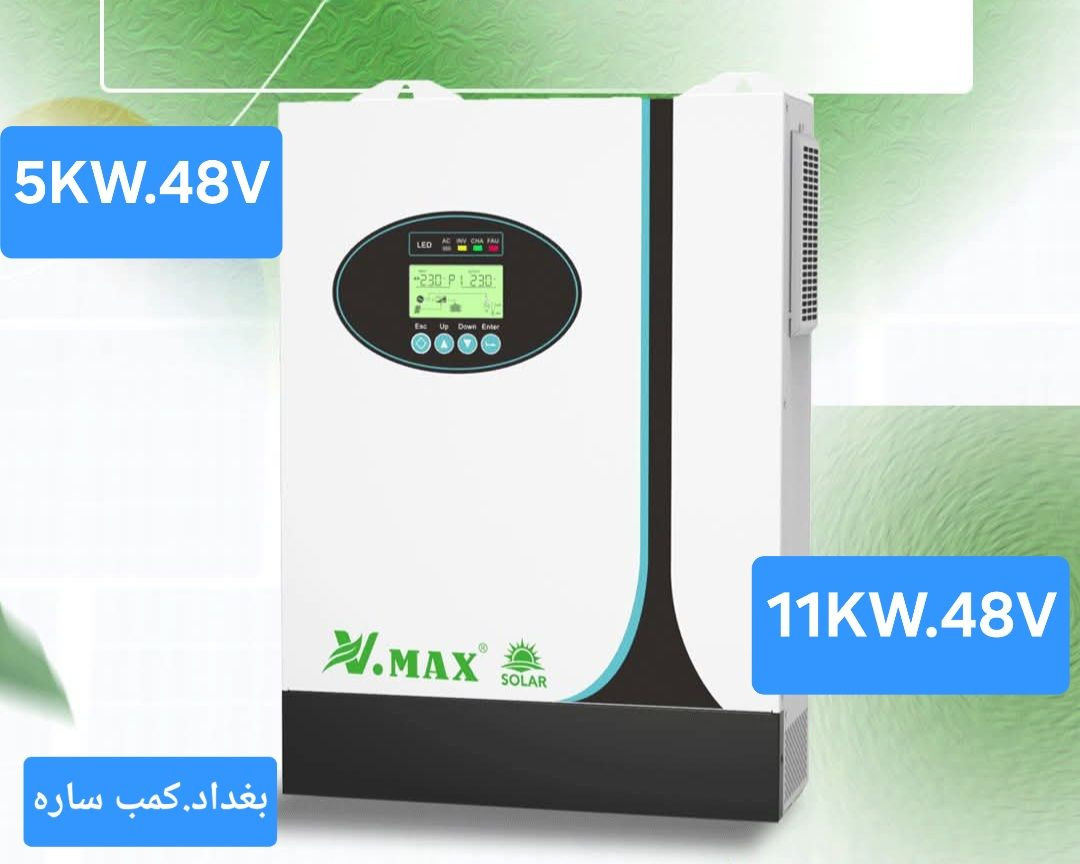 🔷 ماركة: Vmax+ SNADI 🏢 شركة في ماكس – بغداد / كمب سارة ⚡ انفيرتر هجين طاقة شمسية (أوفگريد) – تردد عالي – IP20 🔹 موديل 5 كيلو واط 🔸 القدرة الاسمية: 5KW 🔸 قدرة الإقلاع (الذروة): 10KW 🔸 الأبعاد: 128×320×439 ملم 🔸 الوزن: 9.2 كغم 🔸 الاتصال: RS232 / RS485 / WIFI / USB 🔸 الربط المتوازي: من 1 إلى 6 أجهزة 🔹 موديل 11 كيلو واط 🔸 القدرة الاسمية: 11KW 🔸 قدرة الإقلاع (الذروة): 22KW 🔸 أقصى قدرة ألواح (PV): 5KW × 2 🔸 الأبعاد: 122×403×540 ملم 🔸 الوزن: 15.5 كغم 🔸 الاتصال: RS232 / RS485 / WIFI / USB 🔸 الربط المتوازي: من 1 إلى 6 أجهزة ✅ ضمان سنتين 📍 العنوان: بغداد – كمب سارة(***********)