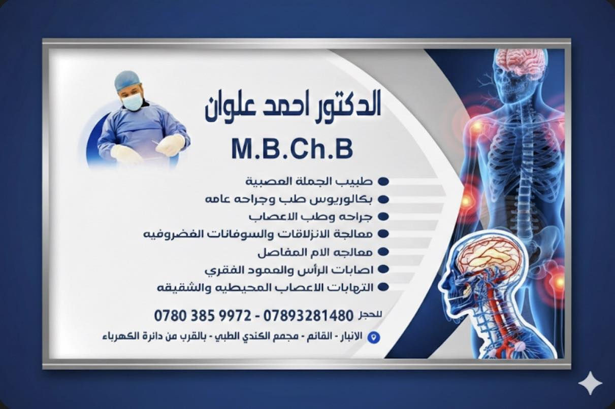 الدكتور احمد علوان جراح الجملة العصبية طب وجراحة عامه 📛🆗️️يمتاز الدكتور بمعالجة 💯 💥الم المفاصل والظهر وعرق النسا 💥الصداع والشقيقه 💥التأهيل مابعد الجلطات الدماغيه 💥مشاكل خدر الاطراف عند مرضى السكري 💥سوفان الفقرات والانزلاق الغضروفي 💥الارق وقلة النوم والتعب والارهاق 💥تقوية الذاكره والدماغ لطلاب المدارس وكبار السن 💥مشاكل فرط الحركة او قلة الانتباه للاطفال 💥تأخر النطق وتأخر المشي عند الاطفال 💥معالجة مشاكل الطول والنمو ملاحظة قرائة جميع اقراص الرنين والمفراس للعمود الفقري والدماغ مجانيه دون الحاجة الى تقرير🔸️ اوقات الدوام طيلة ايام الاسبوع عدا الجمعه من الساعه ٤ عصرا الى ٨ مساءً العنوان 📍 الانبار /القائم/شارع دائرة الكهرباء/ مجمع الكندي الطبي بالقرب من اسواق الحاج لابد للحجز ☎️ *********** ***********