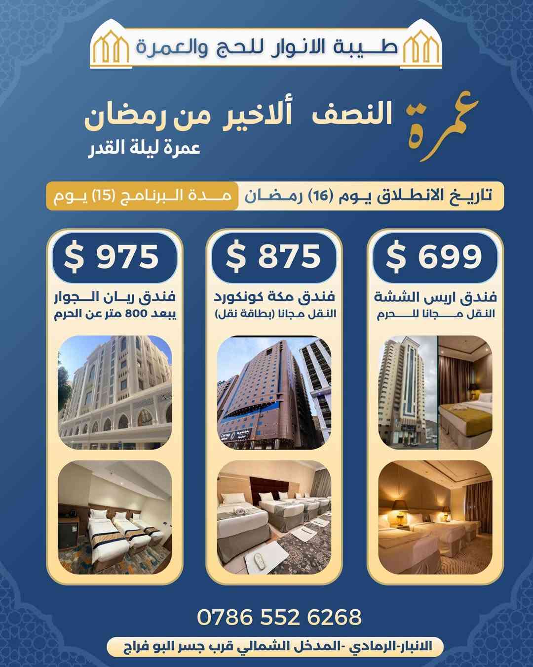 🌙 بُشرى لراغبي الجوار.. عُمرة العشر الأواخر وعيد الفطر مع "طيبة الأنوار" 🕋 ما أجمل أن تختم شهرك في رحاب الحرم، وتتحرى ليلة القدر في أطهر البقاع! تلك الليلة التي هي "خَيْرٌ مِّنْ أَلْفِ شَهْرٍ"، حيث تنزل السكينة وتُجاب الدعوات. انضموا إلينا لنعش أجواءً إيمانية لا تُنسى، وصلاةً تفيض خشوعاً خلف أئمة الحرم المكي الشريف، وفرحة عيدٍ تجمعنا في مكة والمدينة. 📋 برامجنا المتميزة (اختر ما يناسبك): • 1️⃣ البرنامج الأول: برنامج التوفير والراحة • الفندق: أريس الششة (بجوار مول بن داود). • النقل: مجاني تماماً (عبر حافلات الفندق ومحطة الجمرات). • السعر: 699 دولار. • 2️⃣ البرنامج الثاني: برنامج التميز • الفندق: كونكورد مكة (منطقة محبس الجن). • النقل: بطاقة النقل مجانية تماماً على حساب الشركة. • السعر: 875 دولار. • 3️⃣ البرنامج الثالث: برنامج القرب الذاتي • الفندق: ريان الجوار (على بُعد 800 متر فقط). • الميزة: الوصول للحرم مشياً على الأقدام دون انتظار الحافلات. • السعر: 975 دولار. ✨ كل برامجنا تشمل الخدمات التالية: نحن نهتم بأدق تفاصيل رحلتكم لتتفرغوا أنتم للعبادة: • 🎟️ تصريح الدخول للروضة الشريفة (للصلاة في روضة من رياض الجنة). • 🚌 ضيافة الطريق المتميزة واستراحة في شاليهات حائل الفاخرة. • 🕌 جولات المزارات الدينية والتاريخية في مكة والمدينة. • 🎁 هدايا خاصة لكل معتمر + جالون ماء زمزم (5 لتر) لكل شخص. ⚠️ تنبيه هام جداً: نظراً لاعتماد نظام الكوتا (الأعداد المحددة)، فإن المقاعد محدودة جداً. الأولوية لمن يسارع بالحجز وتثبيت مقعده ضمن قوافلنا. 📞 للحجز والاستفسار: تواصلوا معنا الآن عبر رسائل الصفحة أو على الأرقام التالية: *********** *********** 📍 العنوان: [الأنبار الرمادي قرب بوابة المدخل الشمالي] طيبة الأنوار.. رفيقكم المخلص في دروب الطاعات.