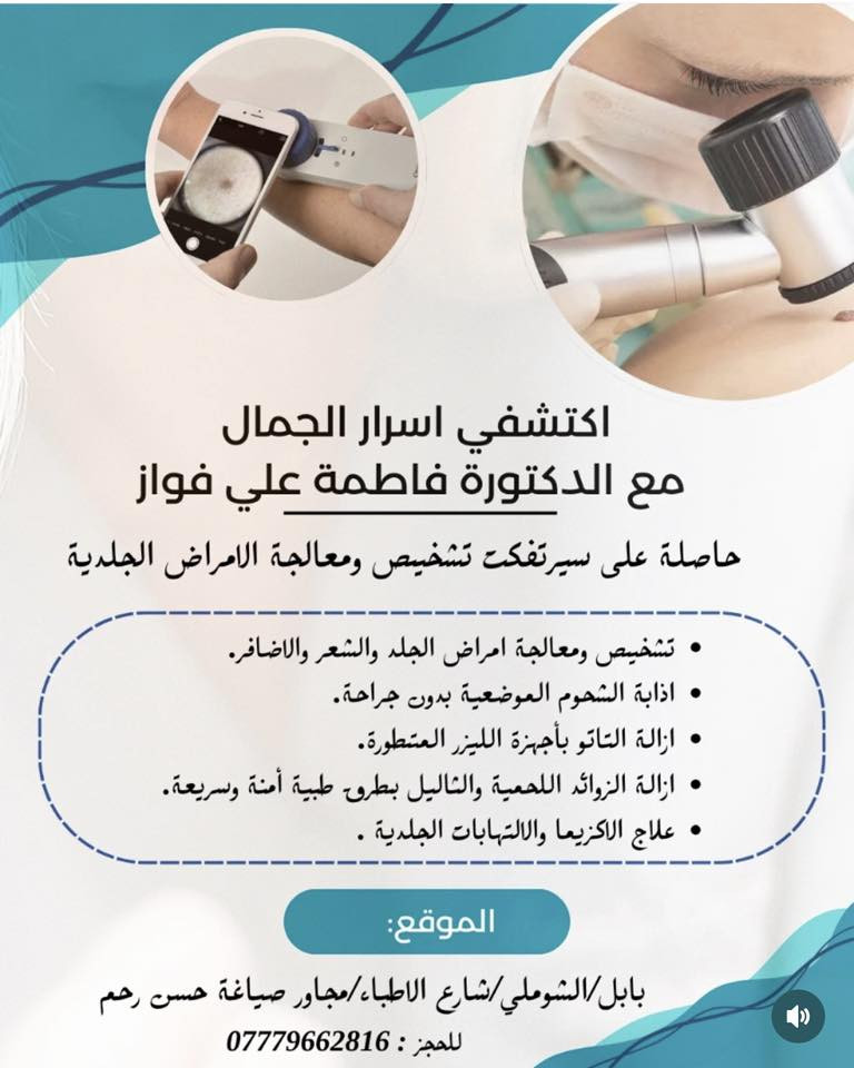 الدكتورة فاطمة علي فواز طبيبة أسرة واختصاص جلدية، تجمع بين الخبرة الطبية والدقة الجمالية لتقديم رعاية شاملة بأعلى المعايير. تقدّم الدكتورة مجموعة متكاملة من العلاجات الجلدية والتجميلية، باستخدام أحدث التقنيات والأجهزة الطبية، وتشمل: • حقن الفيلر والبوتوكس بأمان واحترافية • تنظيف البشرة العلاجي بتقنية الهايدروفيشل • شدّ البشرة بأحدث التقنيات غير الجراحية • معالجة التصبغات، البقع الداكنة، وحب الشباب • حقن الميزوثيرابي للبشرة والشعر • تشخيص ومعالجة أمراض الجلد والشعر والأظافر • إذابة الشحوم الموضعية بدون جراحة • إزالة التاتو بأجهزة ليزر متطورة • إزالة الزوائد اللحمية والثآليل بطرق طبية آمنة وسريعة • علاج الأكزيما والالتهابات الجلدية ✨ لأن بشرتك تستحق العناية الطبية الصحيحة والجمال الطبيعي بثقة وأمان العنوان (الشوملي /شارع الاطباء /محاور صياغه حسن رحم) للحجز والاستفسار : ***********