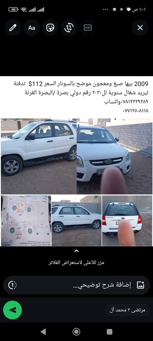 سبورتاج رقم بصرة الدولي لغاية 2030 السنوية باسمي بيها صبغ ومعجون كما موضح بالسونار گير محرك كفالة زوج التايرات الامامي انشد قبل اسبوع فقط باتري جديد تدفئة وتبريد شغال سعر 112$ مع مجال بسيط ***********