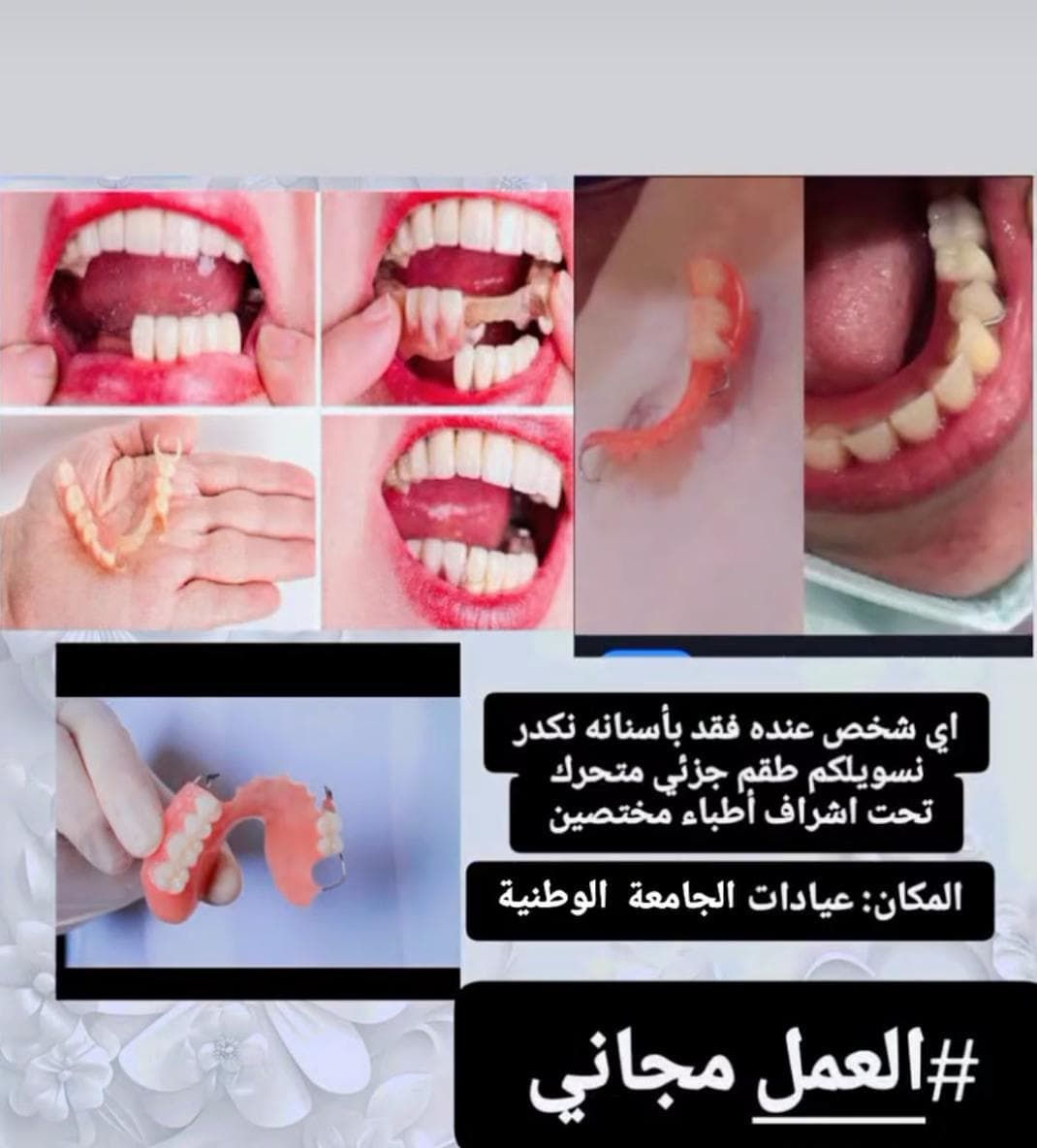 السلام عليكم قلع جذور الاسنان المتبقيه والتالفه مجاناً على يد اطباء مختصين في عيادات الجامعه الوطنيه-ذي قار للاستفسار التواصل واتساب او الاتصال على الرقم ***********