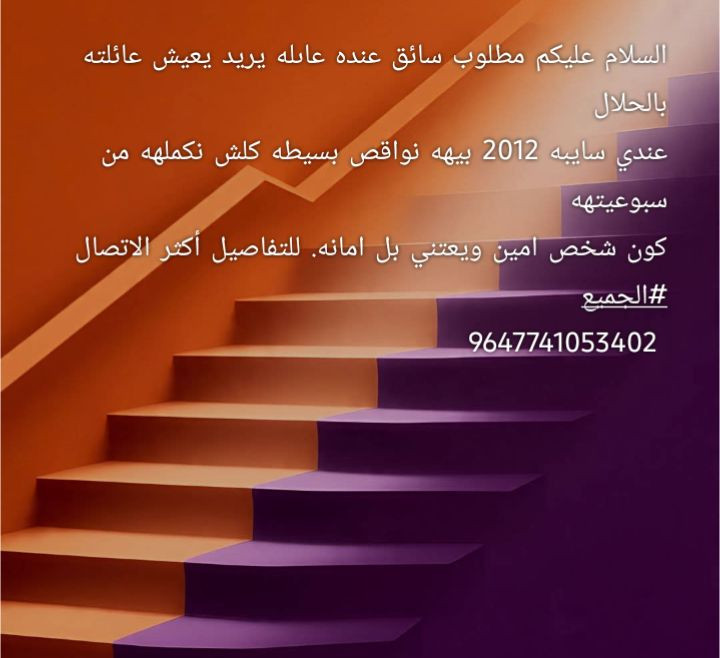 السلام عليكم مطلوب سائق عنده عاىله يريد يعيش عائلته بالحلال عندي سايبه 2012 بيهه نواقص بسيطه كلش نكملهه من سبوعيتهه كون شخص امين ويعتني بل امانه. للتفاصيل أكثر الاتصال #الجميع 9647741053402