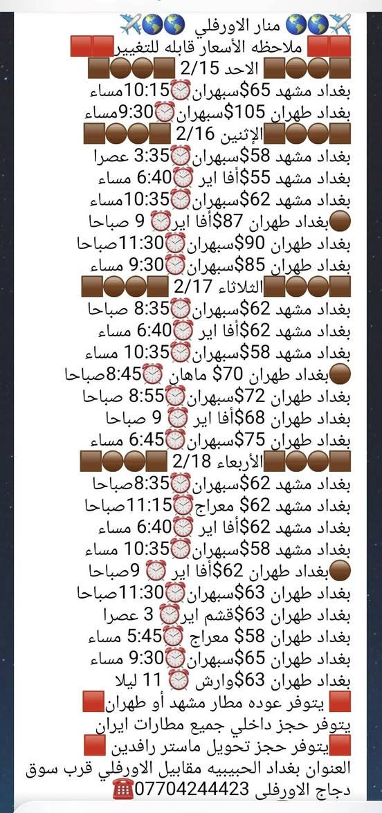 ✈️🌎🌎 منار الاورفلي 🌎🌎✈️ 🟥🟥 ملاحظه الأسعار قابله للتغيير🟥🟥 🟫🟤🟤🟫 الاحد 2/15 🟫🟤🟤🟫 بغداد مشهد 65$سبهران⏰️10:15مساء بغداد طهران 105$سبهران⏰️9:30مساء 🟫🟤🟤🟫الإثنين 2/16 🟫🟤🟤🟫 بغداد مشهد 58$سبهران⏰️3:35 عصرا بغداد مشهد 55$أفا اير ⏰️6:40 مساء بغداد مشهد 62$سبهران⏰️10:35مساء بغداد طهران 87$أفا اير⏰️ 9 صباحا بغداد طهران 90$سبهران⏰️11:30صباحا بغداد طهران 85$سبهران⏰️9:30 مساء 🟫🟤🟤🟫الثلاثاء 2/17 🟫🟤🟤🟫 بغداد مشهد 62$سبهران⏰️8:35 صباحا بغداد مشهد 62$أفا اير ⏰️6:40 مساء بغداد مشهد 58$سبهران⏰️10:35 مساء بغداد طهران 70$ ماهان ⏰️8:45صباحا بغداد طهران 72$سبهران⏰️8:55 صباحا بغداد طهران 68$أفا اير ⏰️ 9 صباحا بغداد طهران 75$سبهران⏰️6:45 مساء 🟫🟤🟤🟫الأربعاء 2/18 🟫🟤🟤🟫 بغداد مشهد 62$سبهران⏰️8:35صباحا بغداد مشهد 62$ معراج⏰️11:15صباحا بغداد مشهد 62$أفا اير ⏰️6:40 مساء بغداد مشهد 58$سبهران⏰️10:35 مساء بغداد طهران 62$أفا اير ⏰️ 9صباحا بغداد طهران 63$سبهران⏰️11:30صباحا بغداد طهران 63$قشم اير⏰️ 3 عصرا بغداد طهران 58$ معراج ⏰️5:45 مساء بغداد طهران 65$سبهران⏰️9:30 مساء بغداد طهران 63$وارش ⏰️ 11 ليلا 🟥 يتوفر عوده مطار مشهد أو طهران🟥 يتوفر حجز داخلي جميع مطارات ايران 🟥يتوفر حجز تحويل ماستر رافدين 🟥 العنوان بغداد الحبيبيه مقابيل الاورفلي قرب سوق دجاج الاورفلي ***********☎️ ☎️***********واتس اب ☎️*********** واتس اب