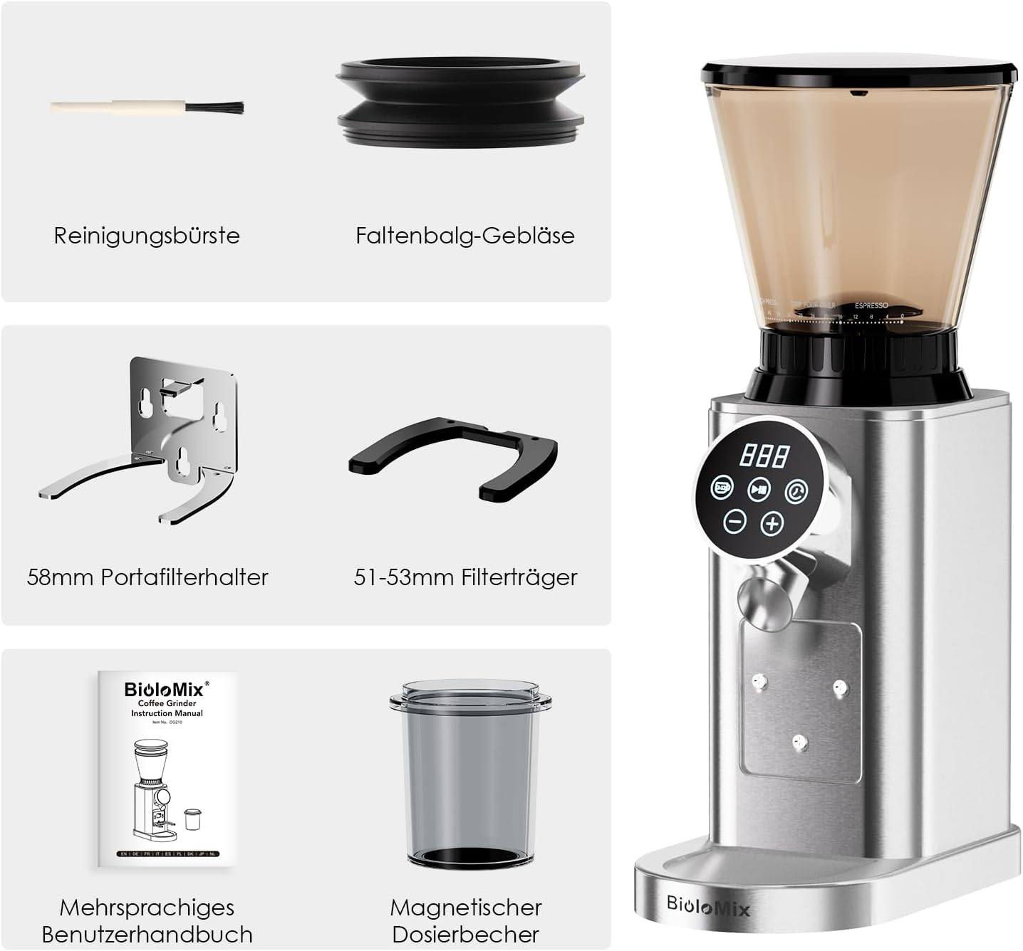 مطحنة قهوة كهربائية من نوع "Biolomix" (موديل CG210). تتميز المطحنة بشاشة لمس LCD وتوقيت رقمي، مع 30 إعدادًا دقيقًا للطحن، من الإسبريسو الناعم جدًا إلى الطحن الخشن للـ "French Press". تحتوي على شفرات مخروطية من الفولاذ المقاوم للصدأ بقطر 40 ملم، مصممة لتقليل حرارة الطحن والحفاظ على زيوت القهوة الأساسية. تستخدم تقنية مضادة للكهرباء الساكنة لضمان عدم التصاق البن المطحون بالغرفة، مما يجعل عملية التنظيف سهلة. تتميز بسعة 300 جرام من حبوب البن في الوعاء العلوي و100 جرام للبن المطحون، مع نظام قفل لسهولة الإزالة والتخزين. **إذا كنت صاحب هذا الإعلان وتريد حذفه لأي سبب، رجاءا أرسل رسالة إلى الدعم الفني**