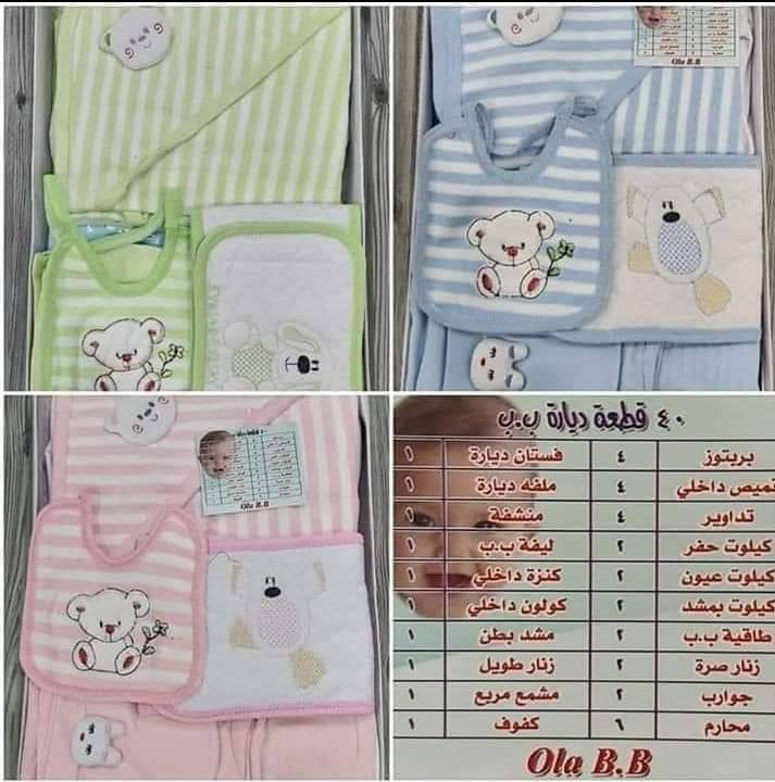 لكل ام عم تجهز 😍😍 مجموعة ديارة ٤٠ قطعة كاملة قطن ممتاااز❤️❤️ مولفة من : بربتوز عدد ٤ قميص داخلي عدد٤ دقونة عدد٤ كيلوت حفر عدد٢ كيلوت عيون عدد٢ كيلوت بمشد عدد ٢ جرابات عدد٢ كنزة داخلي عدد١ طاقية ب ب عدد٢ زنار صرة عدد٢ محارم عدد٦ فستان ديارة عدد ١ ملفة ديارة عدد١ منشفة عدد١ ليفة ب ب عدد ا كولون داخلي عدد١ مشد بطن عدد ١ زنار طويل عدد١ مشمع مربع عدد١ كفوف جوز واحد كيوي، ازرق، زهر **إذا كنت صاحب هذا الإعلان وتريد حذفه لأي سبب، رجاءا أرسل رسالة إلى الدعم الفني**