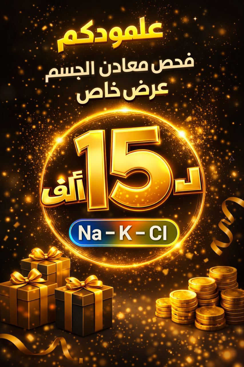 🔬✨🧪 مختبر الساقي التخصصي 🔬 فحص معادن الجسم (Na – K – Cl) 💰 بسعر 15 ألف دينار فقط ⏳ لفترة محدودة ❓ متى تحتاج تسوي فحص الأملاح والمعادن؟ إذا كنت تعاني من: ⚡ تعب وإرهاق مستمر 💓 خفقان أو اضطراب ضربات القلب 🦵 تشنجات عضلية أو ضعف بالأطراف 😵 دوخة أو صداع متكرر 💧 جفاف شديد أو عطش غير طبيعي 🩺 ضغط دم غير مستقر 🩸 مرضى السكري أو الكلى يحتاجون متابعة دورية 📌 ليش هذا الفحص مهم؟ ✔ يكشف اختلال الصوديوم (Na) ✔ يبين مستوى البوتاسيوم (K) وتأثيره على القلب ✔ يقيس الكلوريد (Cl) وتوازن السوائل بالجسم ✔ يساعد الطبيب بتشخيص أسباب التعب والدوخة ✔ ضروري قبل العمليات أو أثناء العلاج الوريدي 🎯 لا تنتظر لحد ما تتضاعف الأعراض اطمئن على صحتك اليوم 📍 مختبر الساقي التخصصي دقة – سرعة – نتائج موثوقة 📍 العنوان: كوت – واسط – الزهراء من جهة كباب الأحمد مقابل صيدلية ابن حيان أسفل عيادة الأسنان د. أنور علاء الربيعي (الباب الخلفي للمستشفى – مقابل مرطبات بابا سنفور) 📞 للاستفسار أو الحجز: *********** ⏰ أوقات الدوام: ▪️ يوميًا: من 3 عصرًا حتى 2 ليلًا ▪️ الجمعة والسبت: من 9 صباحًا - حتى 2 ليلًا