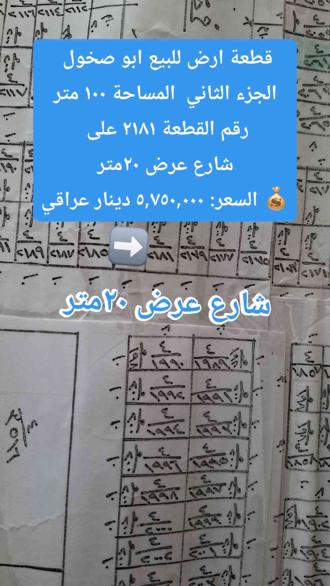 #قطعة ارض للبيع طابو صرف في ابو صخول مقاطعة ٥ جزء الثاني على شارع عرض ٢٠متر المساحة ١٠٠ متر رقم القطعة ٢١٨١ 💰 السعر: ٥,٧٥٠,٠٠٠ دينار عراقي للإستفسار رقم الهاتف*********** ➡️ العقاري احمد العزاوي #دليلك الأول للإستثمار العقاري في محافظة ديالى #نستقبل عروض بيع وشراء قطع الأرضي في جميع مناطق بعقوبة ومحافظة ديالى 📍عنوان المكتب بعقوبة القديمة خلف اعداديه تمريض قرب السجن الاصلاحي مكتب سالم العزاوي للعقار 🏠📲