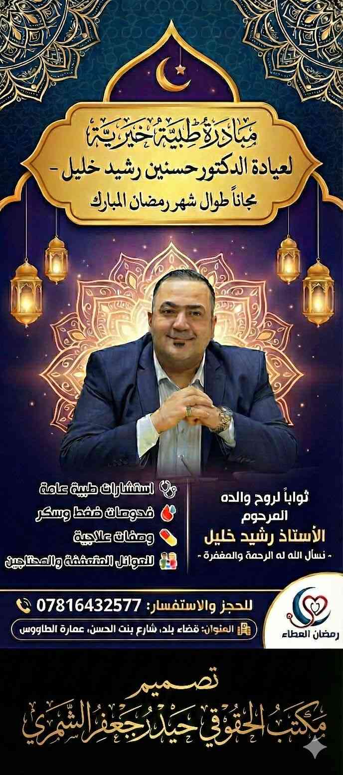 #مبادرات_رمضان 🌙 مبادرة شهر الخير والرحمة 🌙 ((وَيُؤْثِرُونَ عَلَىٰ أَنْفُسِهِمْ وَلَوْ كَانَ بِهِمْ خَصَاصَةٌ)) انطلاقًا من مسؤوليتنا الإنسانية، وطلبًا للأجر والثواب، يعلن الدكتور حسنين رشيد خليل (أخصائي الأمراض الصدرية - مدير مستشفى بلد العام) عن جعل العيادة: ✨ مجانية بالكامل طوال شهر رمضان المبارك ✨ 📌 تفاصيل العيادة: 📍 العنوان: قضاء بلد / شارع بنت الحسن / عمارة الطاووس 🕰 الوقت: من ٣ ظهرًا – ٦ مساءً 📱 للحجز والاستفسار: *********** 🤲 إهداء الثواب: نسأل الله أن يتقبل هذا العمل خالصاً لوجهه الكريم، ويهدي ثوابه إلى أرواح: ▪️ الوالد المربي الفاضل الأستاذ رشيد خليل رمضان. ▪️ المرحومة الحاجة سعاد (أم أحمد). ▪️ المرحومة الحاجة منى (والدة الأخ أبو محمد). ▪️ شهداء العراق، وبالخصوص الشهيد البطل حسين عطية الساعدي (سرايا السلام). نسألكم الدعاء وقراءة سورة الفاتحة. منقول من صفحة عيادة الدكتور حسنين رشيد