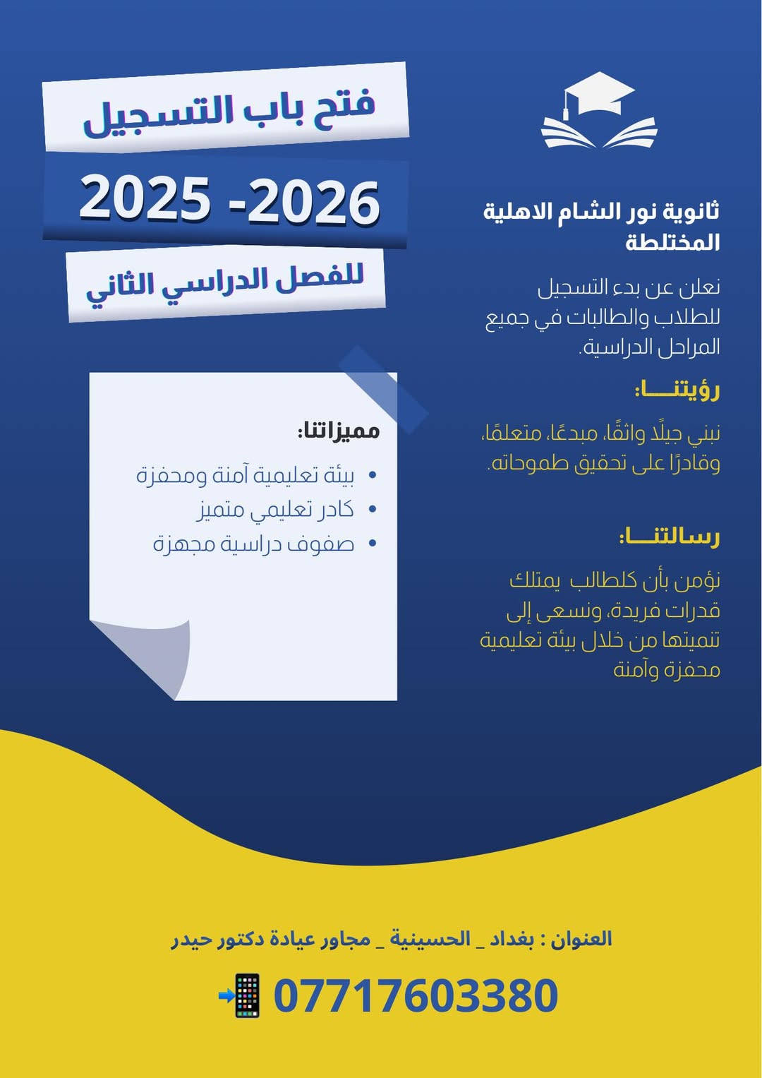 رحلة النجاح تبدأ بخطوة.. والفرصة ما زالت مستمرة🌟 تعلن ثانوية نور الشام الأهلية المختلطة عن فتح باب التسجيل للفصل الدراسي الثاني📚 لأننا نؤمن بأن التعليم رسالة، هيأنا لطلابنا بيئة تعليمية متكاملة تجمع بين الكادر المتميز والأساليب الحديثة ثانوية نور الشام الاهلية المختلطة العنوان : بغداد _ الحسينية مجاور عيادة الدكتور حيدر 📲: *********** #قضاء المعامل #ثانوية نور الشام الاهلية # الحسينية