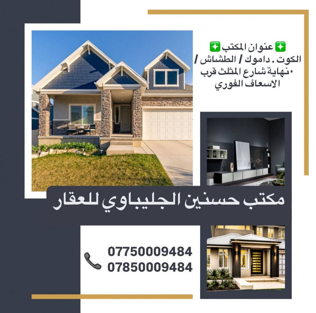 ⭕ يتوفر دار سكن ركن للبيع في منطقة المثلث مقابيل حديقة موقع مميز . 🔴 السعر 220مليون . ♻️ مساحة الدار 210م . ♻️ ( الواجهة 21 × 10 النزال ) ♻️ الدار المشيدة قديما بناء نظيف . الدار المشيد من طابق واحد :: ⚜️ يضم استقبال وهول ومطبخ وغرفتين نوم وصحيات . لمزيد من التفاصيل يمكنكم مراسلتنا على الخاص او الإتصال على الأرقام التالية 📞*********** 📞*********** عنوان مكتبنا الكائن في محافظة واسط الكوت / منطقة داموك الطشاش قرب الاسعاف الفوري .
