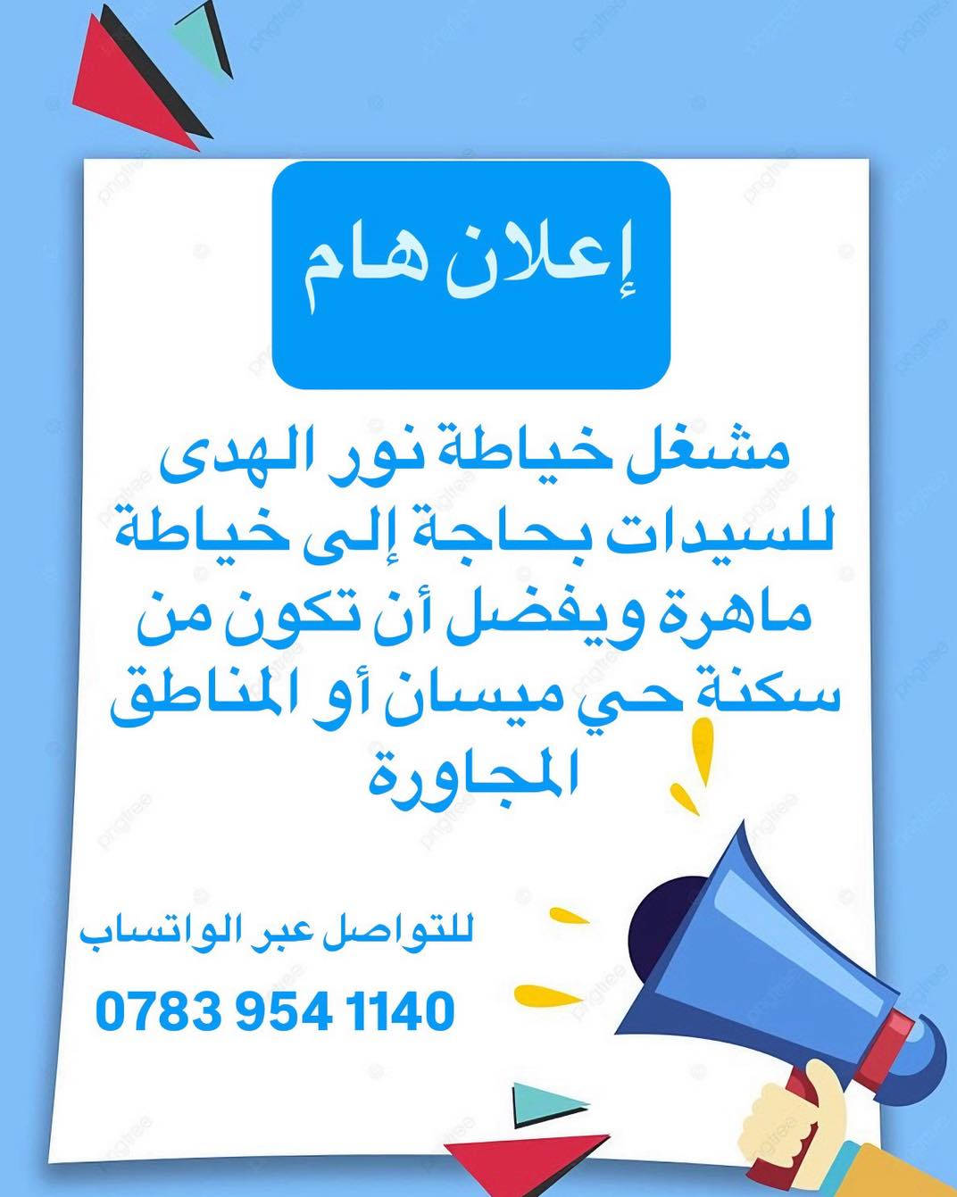 إعلان هام… مشغل خياطة نور الهدى للسيدات بحاجة إلى خياطة ماهرة ويفضل أن تكون من سكنة حي ميسان أو المناطق المجاورة للتواصل عبر الواتساب 0783 954 1140