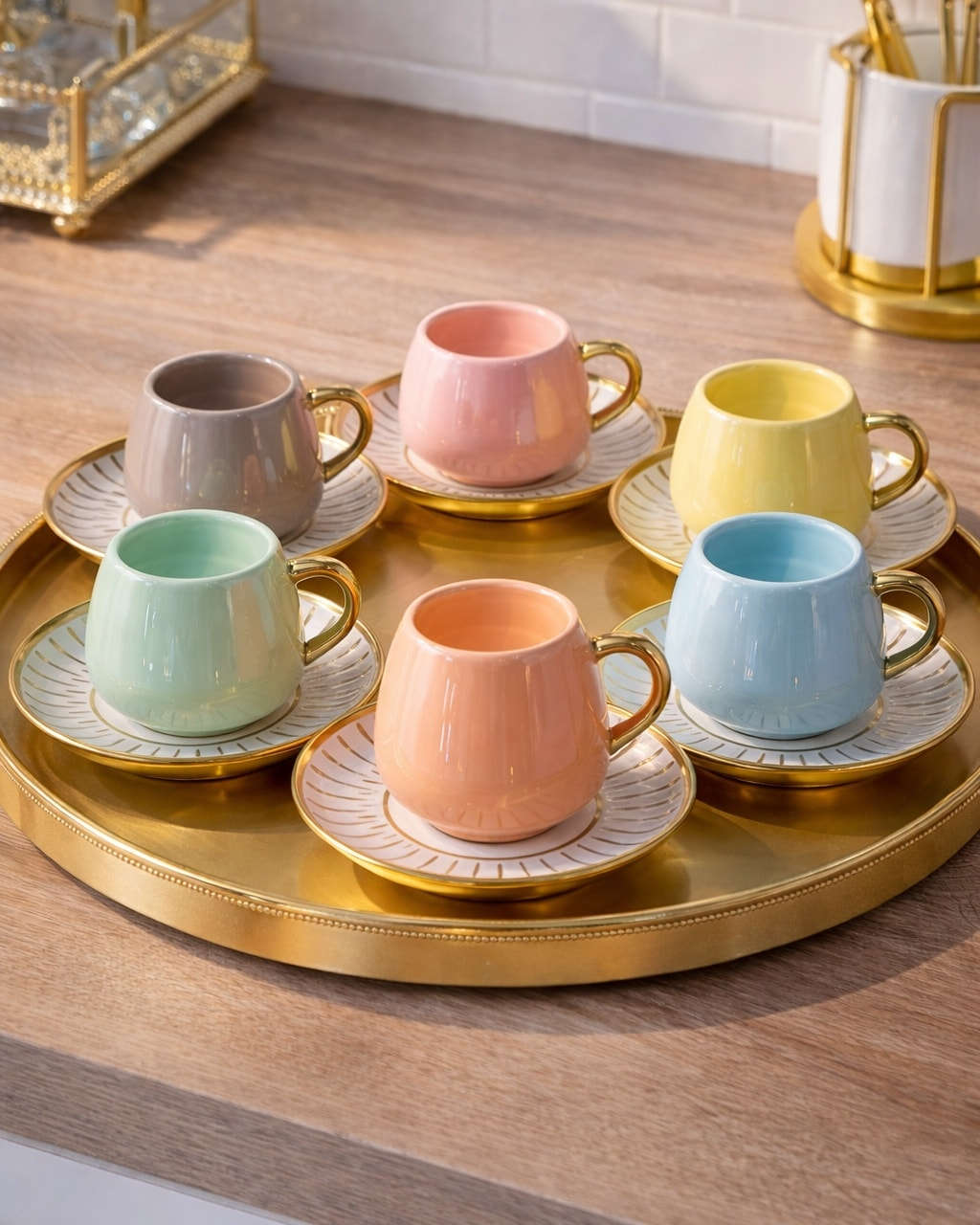 طقم فناجين ست قطع ✨ ست ألوان باستيل ناعمة تفتح النفس 💖💛💙💚🧡🤍 ويجن ويا صحونهم بتفاصيل ذهبية فخمة تلمع بالمطبخ 😍✨ شكلهم راقي ومرتب، يجنن للتقديم للضيوف وللقعدة الحلوة ☕️ ألوان مختلفة حتى كل واحد ياخذ لونه المفضل 😉 إذا تريد تضيف لمسة فخامة ولمعان لمطبخك، هذا الطقم خيارك الصح 👌✨ الفرع الاول : ديالى بعقوبة السوق شارع البالة خلف جامع الفاروق الفرع الثاني : ديالى بعقوبة فلكة الامين شارع الجملة قرب اسواق العزاوي ومتوفر توصيل لانحاء العراق *********** متوفر بيع بالنقد والقسط على ماستر الرافدين وقت دوام من 9 صباحآ الى 9 مساء