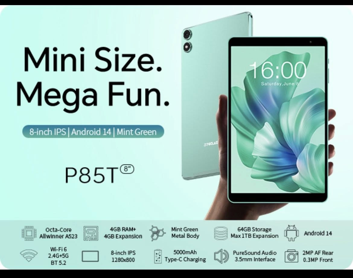 ⸻ 🔥 تابلت Teclast P85T – كامل مع جميع الملحقات! 🔥 يأتي مع الحافظة، لوحة المفاتيح، والشاحن وكل ملحقاته الأصلية لتجربة استخدام كاملة ومتكاملة. استمتع بتجربة سلسة وممتعة مع تابلت Teclast P85T – الخيار الأمثل للتصفح، التعليم، ومشاهدة الفيديو بجودة عالية! ✅ المواصفات الرئيسية: • شاشة 8 بوصات IPS بدقة 1280×800 – ألوان واضحة وزوايا مشاهدة واسعة. • معالج ثماني النواة Allwinner A523 لأداء سريع في التطبيقات اليومية. • ذاكرة 4 GB RAM + تخزين داخلي 64 GB مع إمكانية توسعة حتى 1 TB. • نظام تشغيل Android 13/14 مع دعم تحديثات مستقبلية. • اتصال Wi‑Fi مزدوج التردد + Bluetooth لتجربة سلسة ومتعددة الاستخدامات. • بطارية قوية 5000 mAh تدوم لساعات طويلة. • دعم Google Widevine L1 لمشاهدة الفيديوهات بجودة عالية. ✨ مميزات إضافية: • تصميم معدني أنيق وخفيف الوزن. • مناسب للطلاب، الأطفال، والعمل اليومي الخفيف. • شحن سريع عبر USB‑C. 💰 سعر مميز مقابل الأداء والجودة! 📌 اجعل كل لحظة تجربة ممتعة مع Teclast P85T – كامل ملحقاته! **إذا كنت صاحب هذا الإعلان وتريد حذفه لأي سبب، رجاءا أرسل رسالة إلى الدعم الفني**