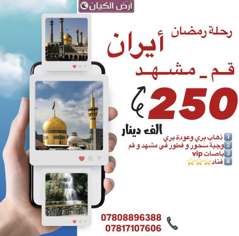 ايران اختصاصنا 🥇أسأل من كان معنا 🥇 🌹ايران ذهاب بري وعوده بري 14 يوم ذهاب طيران والعوده بري ذهاب طيران والعوده طيران 🏖⛱شركة ارض الـكـيـان 🔹🔹سافر واحجز قبل نفاذ المقاعد 🔹🔹 -------------------------------------------- ♦️برنامج إيران 👉👉👉👉👉👉👉👉👉👉 ٠♦️️قم مشهد 🔹️قم زيارة السيدة معصومة ع 🔹️زيارة بيت النور 🔹️زيارة الأربعين علويه 🔹️زيارة مقام الأمام الخضر ع 🔹️زيارة مقام الأمام المهدي 🔹️جمكران ♦️ برنامج مشهد 👉👉👉👉👉👉👉👉👉👉 🔹️زيارة الإمام الرضا ع 🔹️زيارة ياسر وناصر 🔹️التجوال السياحيه 🔹️جبل النور 🔹️البحيرات 🔹️حديقه الحيوانات 🔹️مدينه ألعاب 🔹️المولات 🔹️مطاعم وشلالات شانديز 🔹️التل افريك ♦️باصات 👉👉👉👉👉👉👉👉👉👉 🔹️فنادق درجه اولى 🔺وجبة فطور و سحور 💥مترجم 💥مرشد ديني 💥دليل سياحي 💥جوائز مسابقات وهدايا 💥رحلات مجاني كل هاذة بسعر 250الف فقط 🔺🔺🔺🔺🔺🔺🔺🔺🔺🔺🔺🔺🔺🔺🔺🔺🔺🔺🔺🔺🔺🔺 ✨✨رحلات رمضان كل خميس و ثلاثاء✨✨ / كربلاء يوم الخميس بعد الإفطار عوده بعد صلاه الفجر بسعر 7الف باصات حديثه ومكيفه 💥💥💥💥💥💥💥💥💥💥💥💥💥 نجف + كوفه + سهله يوم ثلاثاء الساعه8 والعوده الساعه3ليلا بسعر 5 الف باصات حديثه ومكيفه 🔥🔥🔥🔥🔥🔥🔥🔥🔥🔥🔥 كروب بغداد الحبيبية 🔥 كروب بغداد السياحي 🔥 مخابز وحلويات باب الاغا للتسوق والاستراحة 🔥 الكاظمية المقدسة 🔥 مدينة العاب الزوراء بسعر 10 الف 🔻🔻🔻🔻🔻🔻🔻🔻🔻🔻🔻🔻 ☎️☎️ *********** *********** 🔻🔻🔻🔻🔻🔻🔻🔻🔻🔻🔻🔻 ♦️اوقات الدوام من 9 صباحا لغاية 10 مساءآ الى محافظاتنا الكريمه يمكنكم الان الحجز عن طريق حواله نعمل دائماً لخدمتكم ورضاكم العنوان الديوانية_ العروبه _شارع الكوام _ قري مدرسة براعم الام