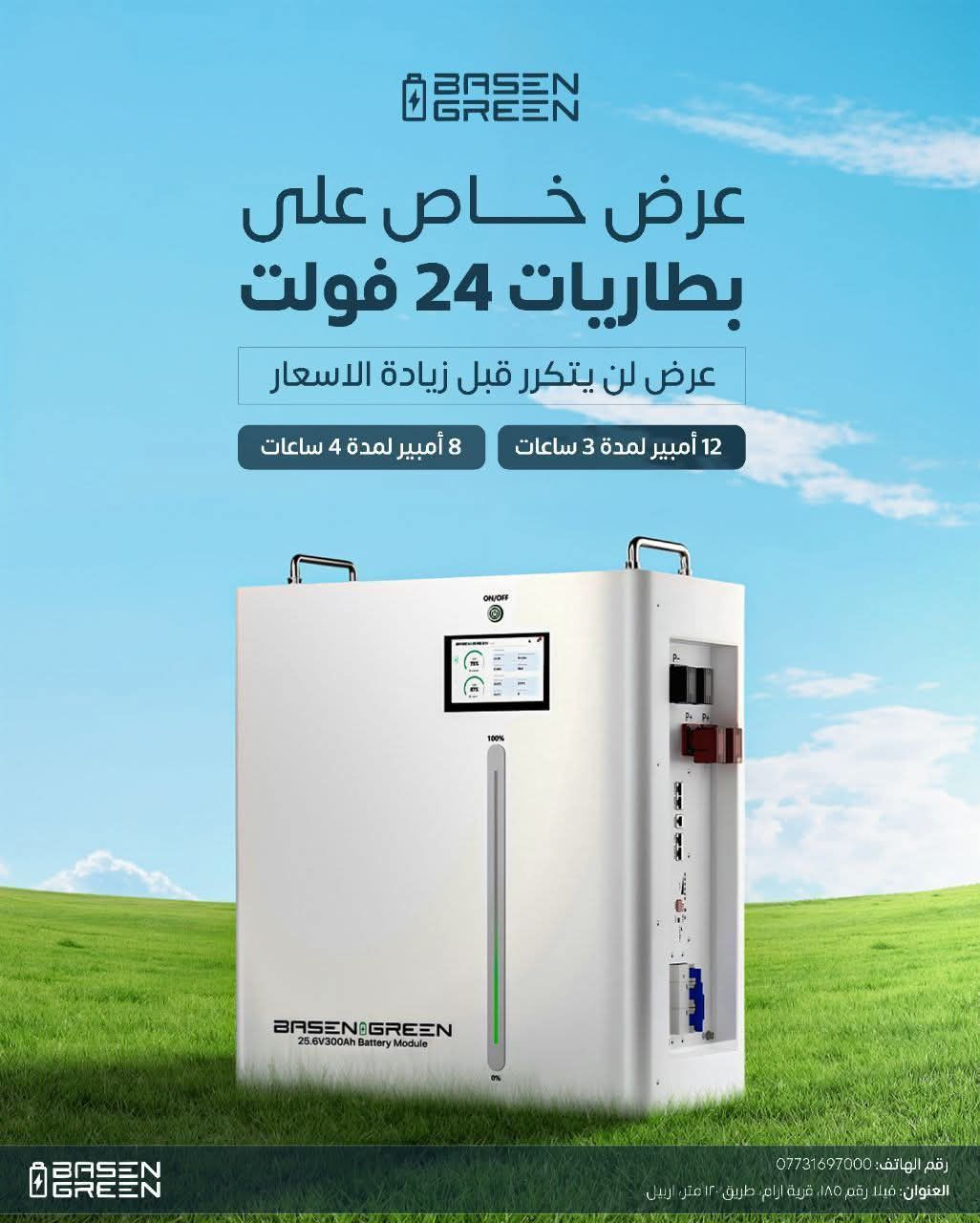 🔖عرض لمدة محدودة، أسعار خيالية على بطاريات 25.6V🔖🔖 بطارية بيسن جرين (8Kwh, 25.6V) أكثر بطارية مناسبة للمنازل متوسطة. يتميز هذا البطارية ب نفس مواصفات وضمان 10 سنوات ✅️. من مواصفات هذا البطارية (8Kwh, 25.6V): 🟢خلاية جديدة من شركة EVE و CATL من فئه Grade A ينطيك 10,000 دورة شحن. 🟢بي ام اس (BMS) عملاق 210امبير مع كل حمايات من شورت او اي كهرباء غير مستقرة⚡️. 🟢الموازن النشيط (Ative Balancer) حتى البطارية ينطيك اعلى قدرة و اعلى عمر مالتها⚖️. 🟢مراوح تبريد البطارية للأماكن الحاره🔥. 🟢شاشة ذكية ينطك كل المعلومات عن البطارية باللغة العربية، بيه بلوتوث و وايفاي 📶 ⚠️بقية كمية قليلة قبل صعود الأسعار 📈 الموقع بغداد وصلاح الدين والموصل التواصل الاتصال على الأرقام التالية ***********)(***********