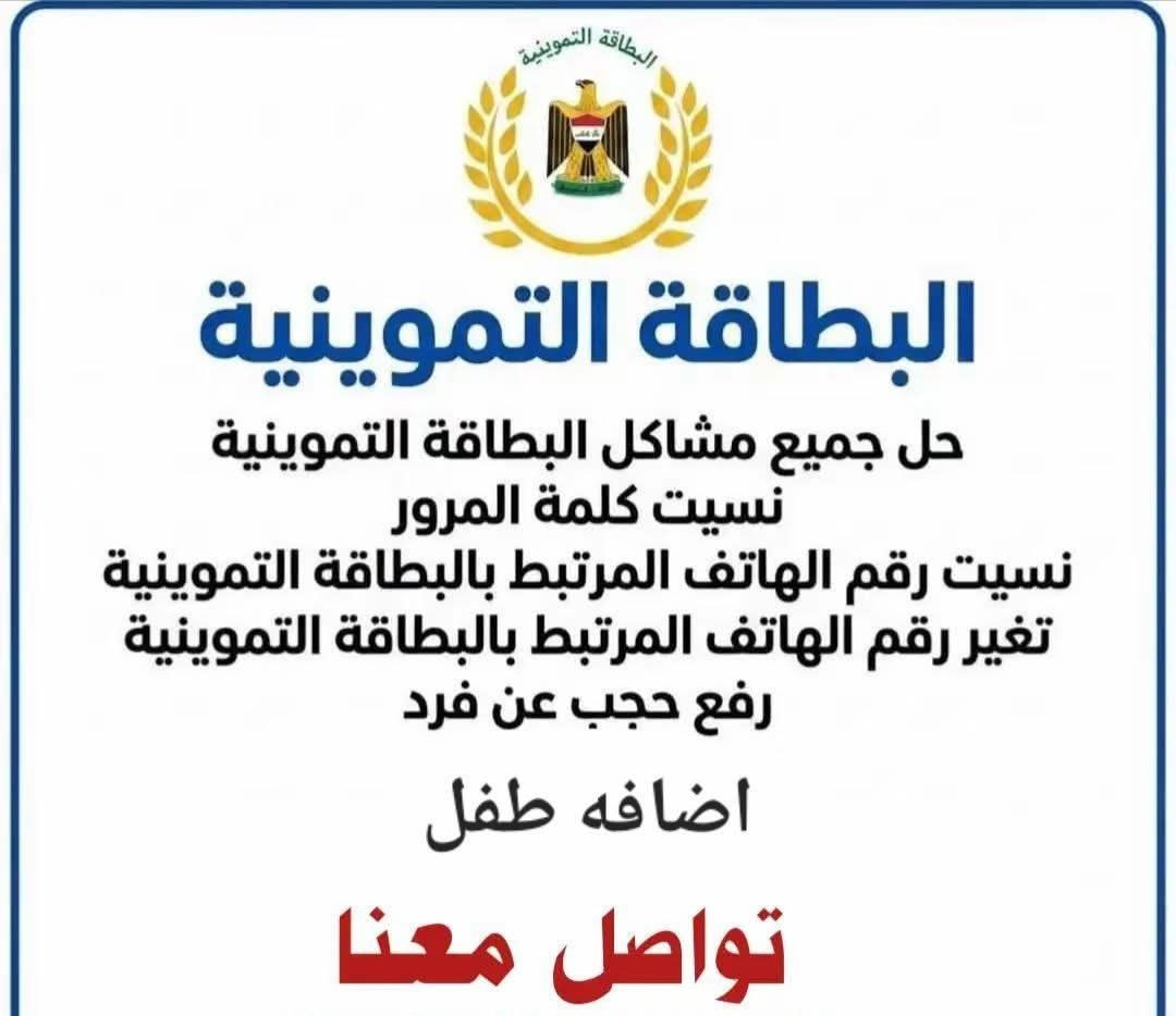 #حل جميع مشاكل البطاقه التموينيه نسيت كلمة المرور او ناسي رمز والرقم كل هاذ سهل بدون ما تراجع مركز التموين عليك مراسله الصفحه او اتصال على الرقم التالي واتساب ***********