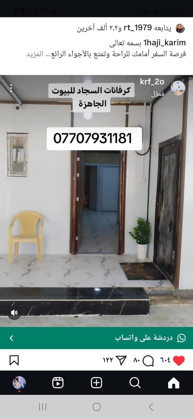 يعلن كرفانات السجاد للبيوت الجاهزة عن استعدادها لبناء الكرفانات والجلمونات والسقائف وفي اسعار مناسبة للاستفسار مراسلتنا على واتساب *********** او الاتصال على الرقم ***********