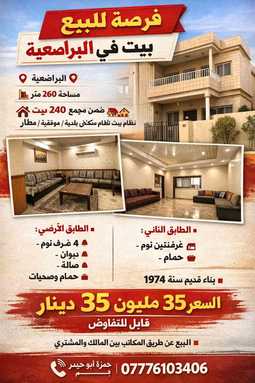 🔥 فرصة للبيع – بيت في البراضعية 🔥 🏠 الموقع: البراضعية 📐 المساحة: 260 متر 🏘 نفس نظام بيوت البلدية / الموفقية / المطار (سكن جامعة) 🔹 عدد البيوت بالمجمع تقريباً 240 بيت 🔹 الأرض عائدة للدولة والموقع للمالك 📌 تفاصيل البيت: ▫️ البيت طابقين ▫️ الطابق الأرضي: 4 غرف نوم ديوان صالة حمام + صحيات ▫️ الطابق الثاني: غرفتين نوم حمام 🔸 الغرفة والمطبخ والديوانية والحمام مبني عليهن طابق ثاني (عكَادة) 🔸 الصالة وغرفتين نوم جينكو مغلفات بسقف ثانوي 📅 سنة البناء: 1974 💰 السعر المطلوب: 35 مليون دينار 📉 قابل للتفاوض البسيط 🤝 البيع يتم عن طريق المكاتب بين المالك والمشتري 📞 للاستفسار والتواصل: حمزة أبو حيدر ***********