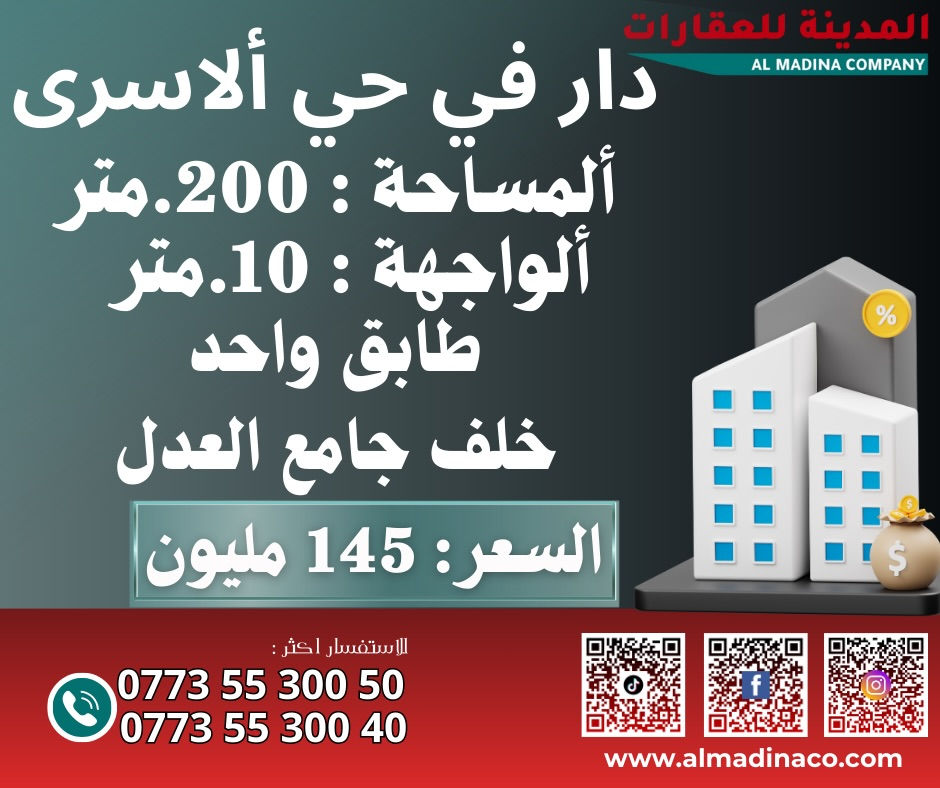 📣 رقم الاعلان ( 3579 ) 🔴 دار للبيع في حي ألاسرى 🔴 المساحة : 200. متر 🔴 الواجهة : 10 .متر 🔴 المواصفات : عبارة عن دار طابق واحد - بمنطقة جميلة 🔴 الموقع : خلف جامع العدل 🔴 السعر : 145 مليون ______ لإستفسار اكثر يرجى اتصال بالارقام *********** *********** *********** _ 🟩تليكرام⬇️ https://t.me/ALMADINA_COMPANY1 ___ 🟩لزياره صفحتنا عبر الفيس بوك⬇️ https://www.facebook.com/almadina.amlak?mibextid=LQQJ4d ____ انستكرام⬇️ https://www.instagram.com/almadina.company?igsh=NGlkMjB1YXRiamZ4&utm_source=qr ___ تيك توك ⬇️www.tiktok.com/@almadina_company________ 📍عنواننا :شارع القدس- مول سنتر كركوك - مقابل محطة وقود القدس👷🏻♂️🏠🧱عقارات المدينة