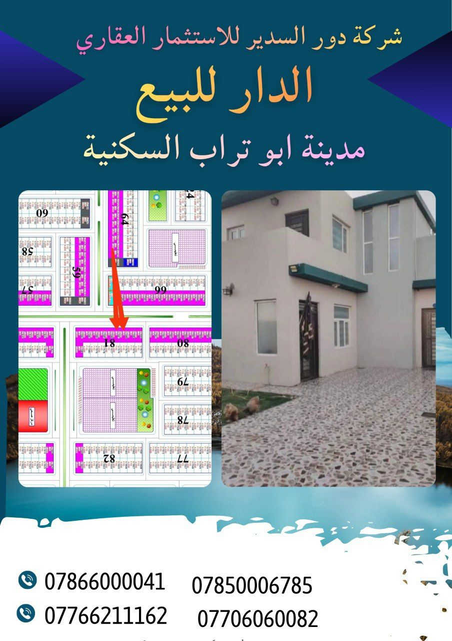 شركة روعة دور السدير للاستثمار العقاري دارين طبك للبيع في #مجمع_ابو_تراب_السكني 📍مرحلة اولى / بلوك 81 / دار 1588 و 1587 📍مساحة الدار 200 متر طابق ونص 📍يحتوي على اضافات ََ📍طابق ونصف 3 غرف نوم 📍موقع مميز ع شارع ٣٠ 📍يباع نقد بسعر مناسب جدا 📍سند حر للاستفسار *********** 📞 *********** *********** 📞 *********** 📍موقع الشركه (( النجف الأشرف / حي النداء / شارع المجمعات / خدمي مجمع الاميرات الاولى مقابل مجمع الكرار ))
