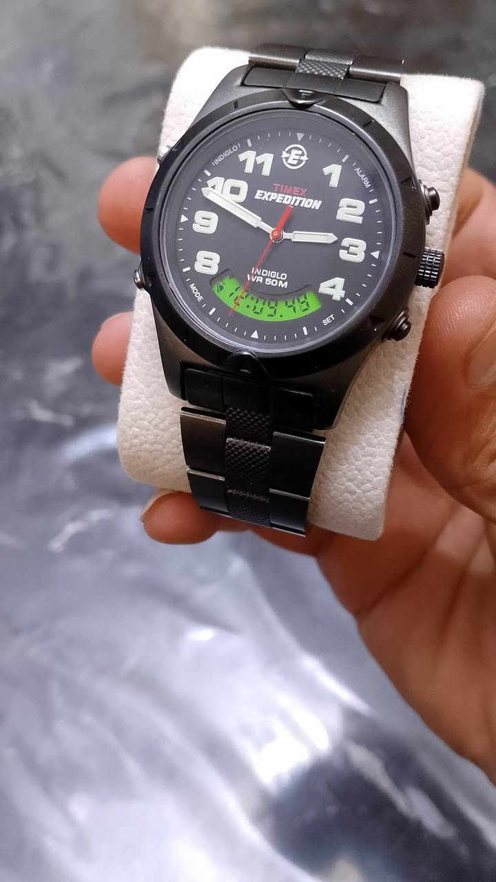 تايمكس إكسبيديشن أهم المميزات ساعة تجمع بين وظائف الكرونوغراف الرقمي والتناظري مزودة ب منبه وإضاءة ليلية بتقنية إنديجلو تتميز الساعة بميناء أسود بالإضافة إلى وظائف الكرونوغراف وعرض اليوم والتاريخ والشهر مع حساب أوقات اللفات والأجزاء ومؤقت عد تنازلي 24 ساعة ومنبه يومي وثلاث مناطق زمنية. زجاجها مصنوع من الكريستال المعدني المقاوم للصدأ والخدوش وهي مقاومة للماء حتى عمق 50 مترًا. **إذا كنت صاحب هذا الإعلان وتريد حذفه لأي سبب، رجاءا أرسل رسالة إلى الدعم الفني**