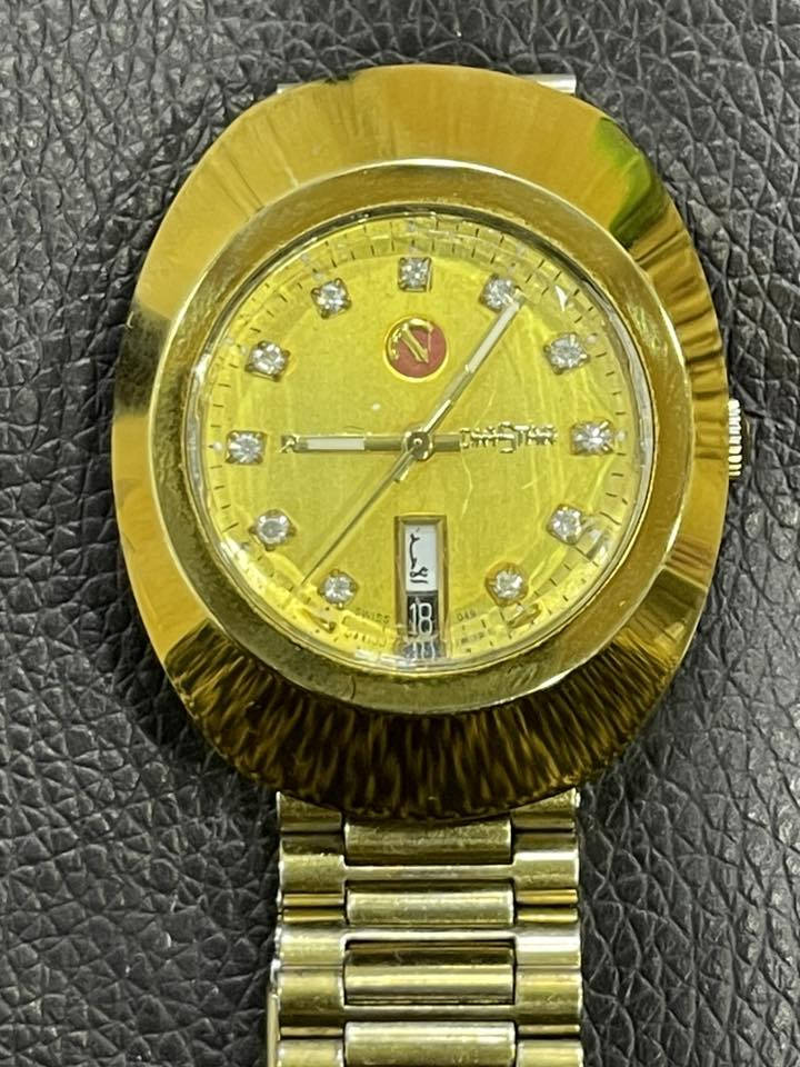 السلام عليكم ساعه رادو دياستار أوريجينال (Rado DiaStar Original)، وهي ساعة سويسرية كلاسيكية اشتهرت بأنها أول ساعة مقاومة للخدش في العالم عند إطلاقها لأول مرة. هيكل "بيضاوي" مميز باللون الذهبي مصنوع من المعدن الصلب (Hardmetal) أو السيراميك المقاوم للخدش. ميناء باللون الذهبي مرصع بـ 11 فصاً من الزركون أو الألماس الصناعي كعلامات للساعات. تعرض الساعة نافذة لليوم والتاريخ عند تعمل بماكينة أوتوماتيكية سويسرية الصنع، وتتميز بشعار المرساة الدوار الخاص بماركة رادو. موقع الساعة السادسة، وتظهر في الصورة باللغة العربية (الأحد) المتانة: تأتي مع كريستال سافاير مقاوم للخدش وسوار من الفولاذ المقاوم للصدأ المطلي باللون الذهبي. سعر ب100وبيها مجال **إذا كنت صاحب هذا الإعلان وتريد حذفه لأي سبب، رجاءا أرسل رسالة إلى الدعم الفني**
