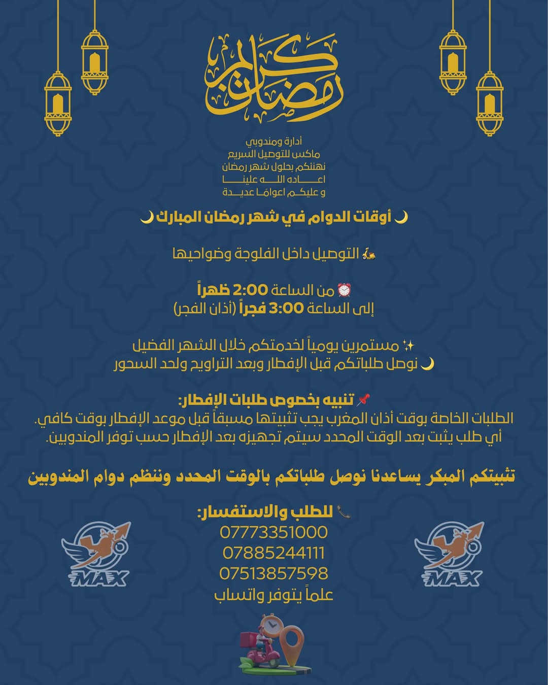 🌙 أوقات الدوام في شهر رمضان المبارك 🌙 🛵 التوصيل داخل الفلوجة وضواحيها ⏰ من الساعة 2:00 ظهراً إلى الساعة 3:00 فجراً (أذان الفجر) ✨ مستمرين يومياً لخدمتكم خلال الشهر الفضيل 🌙 نوصل طلباتكم قبل الإفطار وبعد التراويح ولحد السحور 📌 تنبيه بخصوص طلبات الإفطار: الطلبات الخاصة بوقت أذان المغرب يجب تثبيتها مسبقاً قبل موعد الإفطار بوقت كافي. أي طلب يثبت بعد الوقت المحدد سيتم تجهيزه بعد الإفطار حسب توفر المندوبين. 🙏 تثبيتكم المبكر يساعدنا نوصل طلباتكم بالوقت المحدد وننظم دوام المندوبين 📞 للطلب والاستفسار: *********** *********** *********** علماً يتوفر واتساب