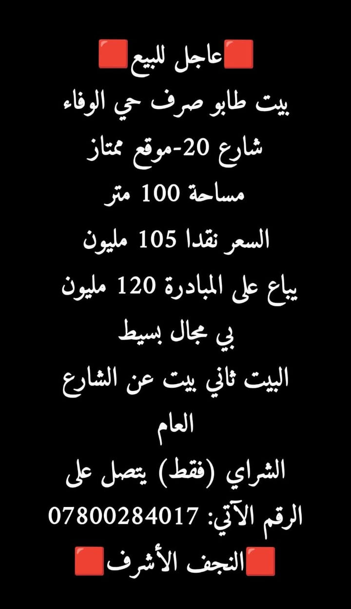 عاجل للبيع بيت طابو صرف حي الوفاء شارع ٢٠ موقع جدا ممتاز طابق واحد السعر نقد ١٠٥ ويباع على المبادره *********** النجف الاشرف النجف, العراق