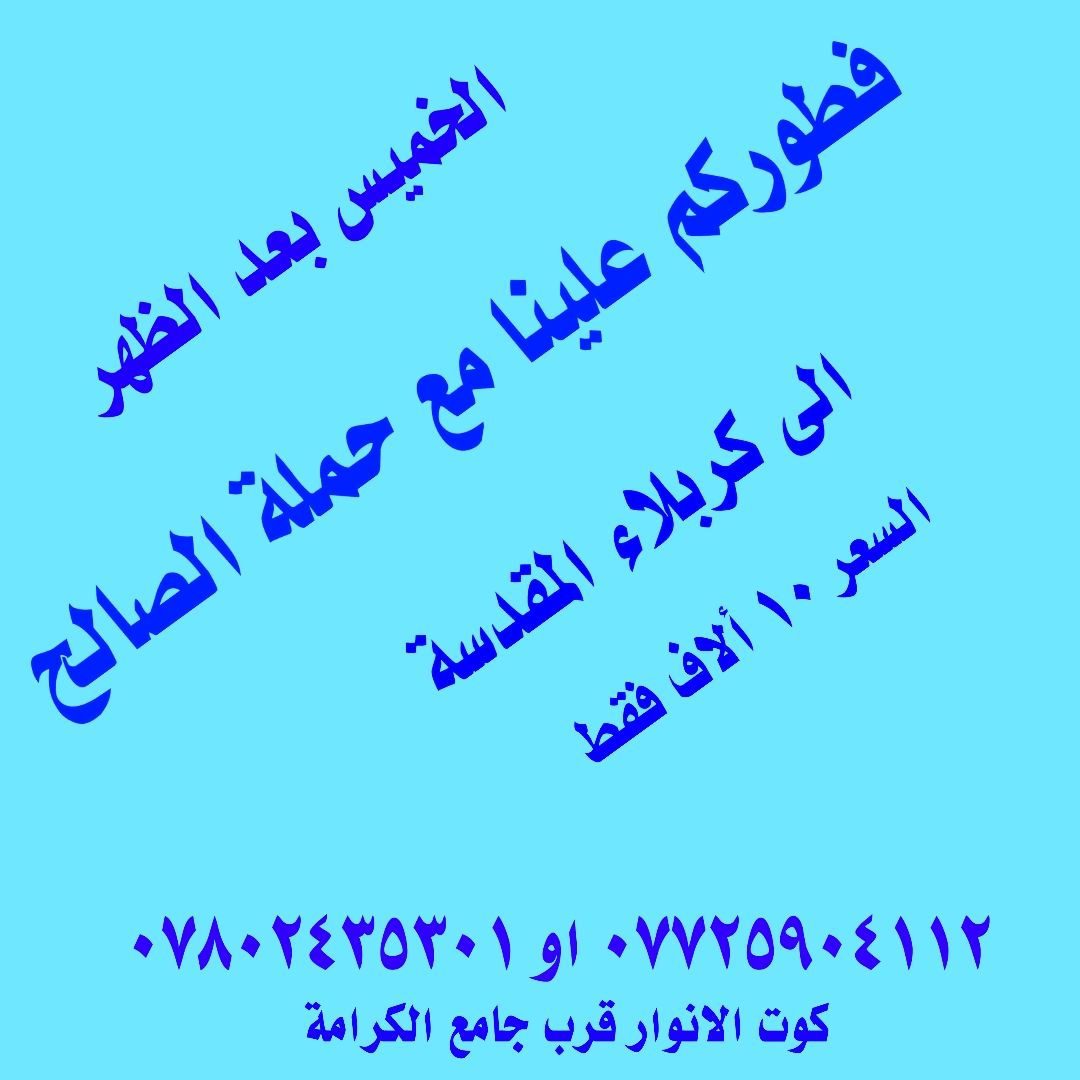 👈 برنامج شهر رمضان مع حملة الصالح 👈 كل يوم خميس بعد الظهر الى كربلاء 🍝 فطوركم علينا🍝 👈 العودة الجمعة بعد صلاة الصبح 🚎السيارة باص منشأة🚎 ✴ السعر ١٠ ألاف فقط ✴ ✅ *********** ☎ واتساب ✅ *********** حيدر صالح ✅ ***********☎ علي صالح