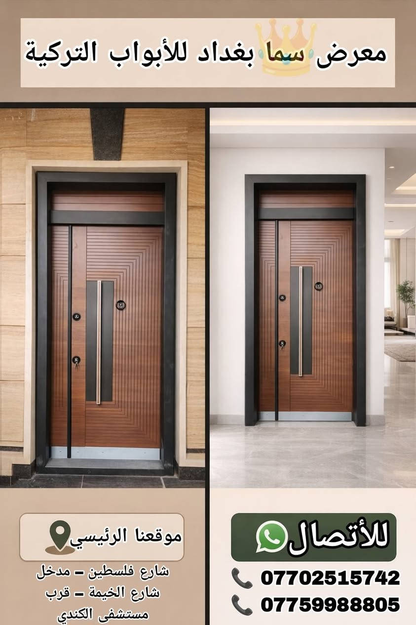 🔔 معرض سما بغداد للأبواب التركية🔔 🔩 تصفيح كامل مقاوم للكسر 🛠️ حديد سماكة 1.5 ملم متين وقوي 🇹🇷 صناعة تركية أصلية بجودة عالية 🔐 قفل رئيسي + قفل أمان إضافي لحماية مضاعفة 👁️ عدسة رؤية واضحة وآمنة 🔨 مطرقة ثقيلة لمتانة إضافية 🚪 تصميم وجهين أنيق (داخل + خارج) 🛡️ تحصين كامل … قوة، أمان، وفخامة بنفس الوقت 💰 أسعارنا مناسبة للجميع 🚚 يتوفر توصيل لكافة المحافظات 📸 باقي الصور والتفاصيل راسلونا 📲 للاستفسار (واتساب): 📞 *********** 📞 ***********