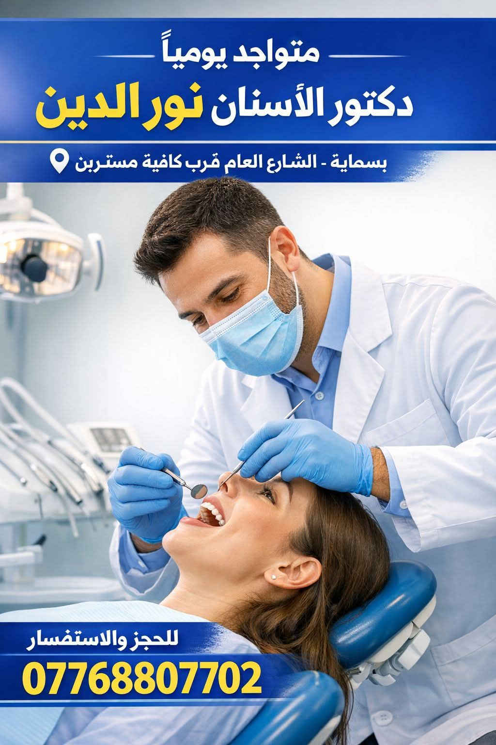 متواجد يوميا دكتور الاسنان نور الدين 🧑⚕️ لعمل الحشوات🦷 والإبتسامة 👄 وكافة مشاكل الأسنان 👍 العنوان بسماية الشارع العام قرب كافية مستربن للحجز والاستفسار ***********