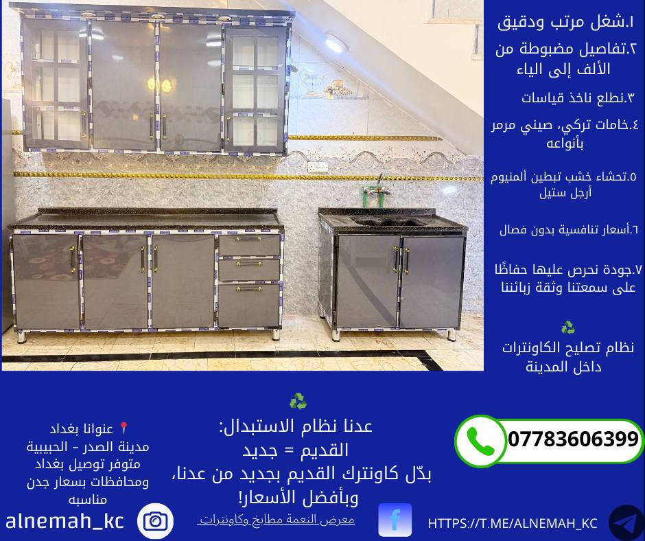 💎 مطابخ فخمة | مطابخ شقق | مطابخ حارة وباردة 🔹 تفصيل على الذوق – بأعلى المواصفات 🛠️ الأسعار حسب نوع المادة: ♻️ نظام استبدال الكاونتر القديم بالجديد متوفر 🧰 خدماتنا تشمل: ✅ كادر متخصص لأخذ القياسات بدقة ✅ كادر تركيب (شدّ) الكاونترات ✅ كادر نقل وتصعيد – حتى الطوابق العليا ✅ توصيل إلى بغداد وجميع المحافظات 📲 تواصل معنا الآن واحجز موعدك *********** 💬 نصمّم لك مطبخك على مزاجك – جودة، دقة، فخامة