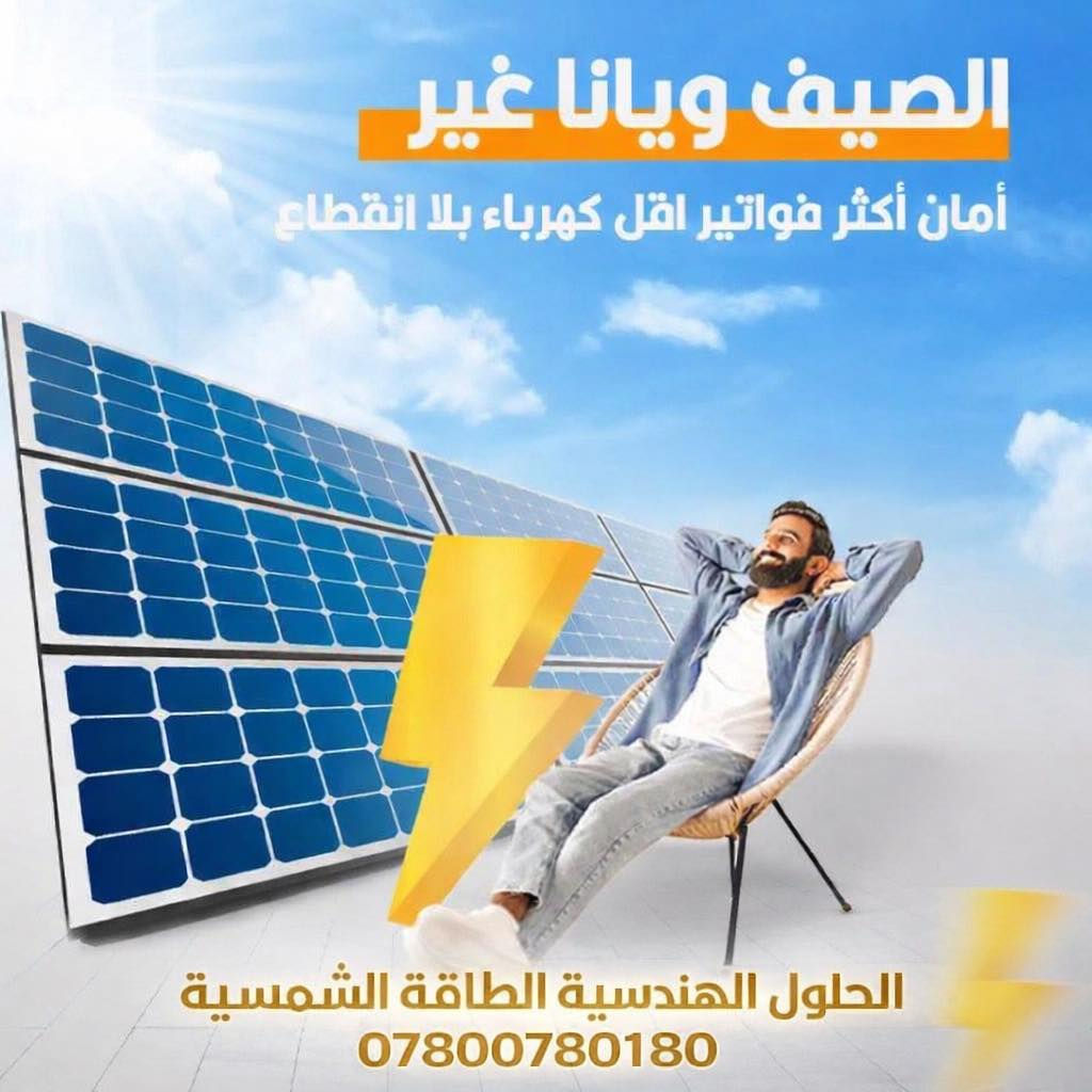 ليش تدفع لغيرك.. والشمس تنطيك ببلاش؟ ☀️🔋 حوّل بيتك لمنظومة طاقه ذكية مع مكتب الحلول الهندسية للطاقة الشمسية. ✅ وداعاً للفواتير المرتفعة. ✅ كهرباء مستقرة 24 ساعة. ✅ تنفيذ وتنصيب هندسي ممتاز. ✅كفائة عالية. ✅ضمان حقيقي 5 سنوات. ✅صيانة دورية مجانية. ✅واخيراً اسعار تنفاسية وتوفير فوري. العنوان / الانبار / القائم 📞للأستفسار الاتصال ع الرقم ***********