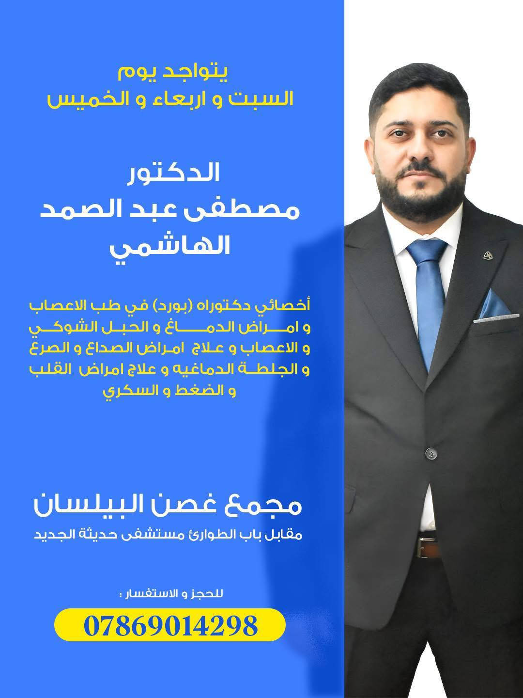 🔶️🔶️🔶️ #أهلا_رمضان #تنويه لمراجعي عيادتي الاعزاء #دوام العيادة في شهر #رمضان المبارك من الساعة 2 عصرا إلى الساعة 5 ونصف مساءا إن شاء الله تعالى #الدكتور مصطفى عبدالصمد الهاشمي 🟡 دكتوراه ( بورد ) طب الجملة العصبية 🟡 زميل المجلس العراقي للأختصاصات الطبية 🟡 عضو الجمعية الأمريكية لطب الأعصاب 🟡 كلية الطب / جامعة الموصل M.B.Ch.B / F.I.C.M.S ( Neurology ) تقدم عيادتنا العلاج المتخصص لأمراض الدماغ والحبل الشوكي والأعصاب والعضلات. 🧠👨⚕️💪 #عيادة_حديثة 🏥 مجمع غصن البيلسان مقابل طوارىء مستشفى حديثة الجديد. 📍 أيام العمل (السبت والأربعاء والخميس والجمعة من كل أسبوع). 🗓️✅️ #للحجز والاستفسار *********** #رمضان مبارك وتقبل الله منا ومنكم صالح الأعمال
