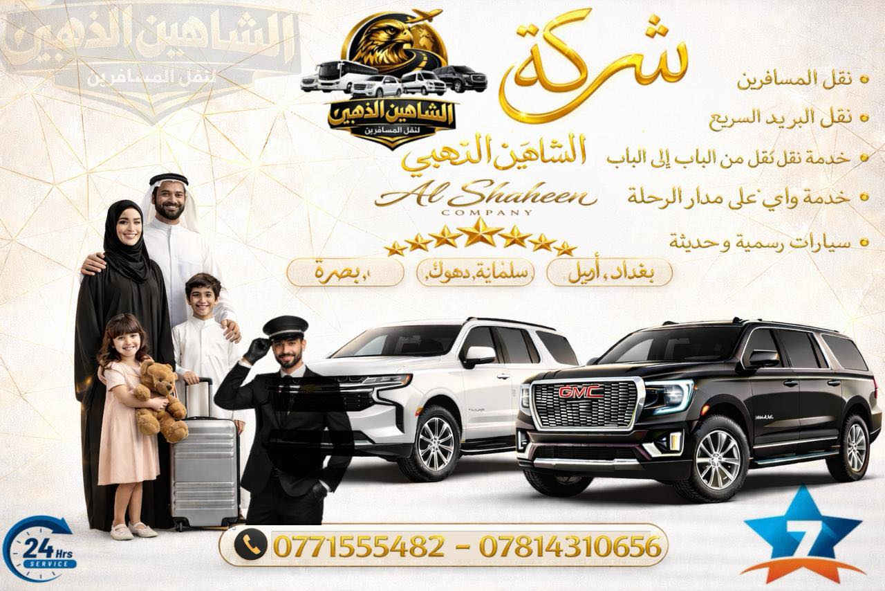 اتريد اتسافر لا تحتار يمك الشاهين الذهبي 🔹 ليش تختار الشاهين الذهبي؟ ✔️ سيارات حديثة ومكيفة لراحتكم. ✔️ كباتن ذو خبرة عالية وأخلاق راقية. ✔️ التزام بالمواعيد وتوصيل آمن. ✔️ خدمة عملاء متوفرة على مدار الساعة. سياراتنا جميعها :- رسميه ومسجله في وزاره النقل • خطوط رسميه لكل محافضه • 🕐 متوفرين 24 ساعة لخدمتك أينما كنت 📶 إنترنت مفتوح Wi-Fi طوال الرحلة لتبقى على تواصل 📦 خدمة البريد السريع من باب بيتك إلى باب المستلم 💊 توصيل الدواء مجاناً إلى كل المحافظات • 🛡️ أمان – التزام بالمواعيد – راحة تامة للمسافرين والوفود يتوفر حجز نفرات يتوفر حجز مركبه خاصه خدمة نقل من والى :- ( اربيل - بغداد - سليمانية - دهوك) السيارات المتوفره :- { جي ام سي ، تاهو ، باسفيكا ، اوباما ، جارجر } 🩵💙🩵 يتوفر سيارات خاصة من و الى (البصرة - كركوك - الموصل - صلاح الدين - كربلاء -النجف)  تعال خاص وتدلل🏵️🏵️ او الاتصال *********** 0781 343 0656 تنبيه / الحجز عبر ارقام الشركة حصراًاي تواصل مع الكابتن نحن غير مسوؤلين عن الحجز •  #الرمادي_بغداد_سليمانية_اربيل_دهوك_شقلاوة_سفر_نقل_كردستان #كركوك_بصره #عراقي #بغداديات #سفر_سياحة #اكسبلور_فلو #اربيل #مشاهير_العراق_مشاهيرالكويت_مشاهير_عمان_مشاهير_مصر_مشاهير_لبنان_مشاهير_السعوديه_مشاهير_العراب