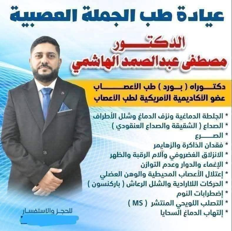 #هااام يتواجد الدكتور كل يوم( الخميس) فقط الساعة (9_12:30) 🛑الدكتور ( مصطفى عبدالصمد الهاشمي) حاصل على درجة الدكتوراه (البورد) في طب الأعصاب. 🧠👨⚕️📚 💥كل يوم (خميس) الساعة (9_12:30)صباحاا وهو عضو في الأكاديمية الأمريكية لطب الأعصاب. 🧠👨⚕️📚 يقدم الدكتور العلاج المتخصص لأمراض الدماغ والحبل الشوكي والأعصاب والعضلات. 🧠👨⚕️💪 يشمل نطاق العلاج: الجلطات الدماغية الإقفارية والنزفية. 🧠🩸✅️ بالإضافة إلى علاج حالات شلل الأطراف. 🦵✅️ كما يتم تقديم العلاج لأنواع الصداع المختلفة (بما في ذلك الشقيقة). 🤕✅️ ويشمل العلاج أيضًا التصلب اللويحي المتعدد. 🧠✅️ بالإضافة إلى علاج حالات الصرع (اضطراب النشاط الكهربائي في الدماغ). 🧠⚡✅️ وكذلك علاج حالات فقدان الذاكرة (الزهايمر). 🧠👴✅️ ويتم تقديم العلاج لاضطرابات التوازن والدوار والإغماء. 😵💫✅️ بالإضافة إلى علاج اعتلال الأعصاب المحيطية والوهن العضلي. 🧠💪✅️ كما يشمل العلاج حالات الانزلاق الغضروفي وآلام الرقبة والظهر. 🤕✅️ ويتم أيضًا علاج حالات الشلل الرعاش (باركنسون). 🧠👴✅️ بالإضافة إلى علاج التهاب السحايا وخلايا الدماغ. 🧠✅️ ويتم توفير العلاج لاضطرابات النوم. للحجز والاستفسار الاتصال *********** العنوان /قضاء عنه --مجمع سما عنه الطبي _ مجاور صيدلية سما عنه _ مقابل السوق الاول
