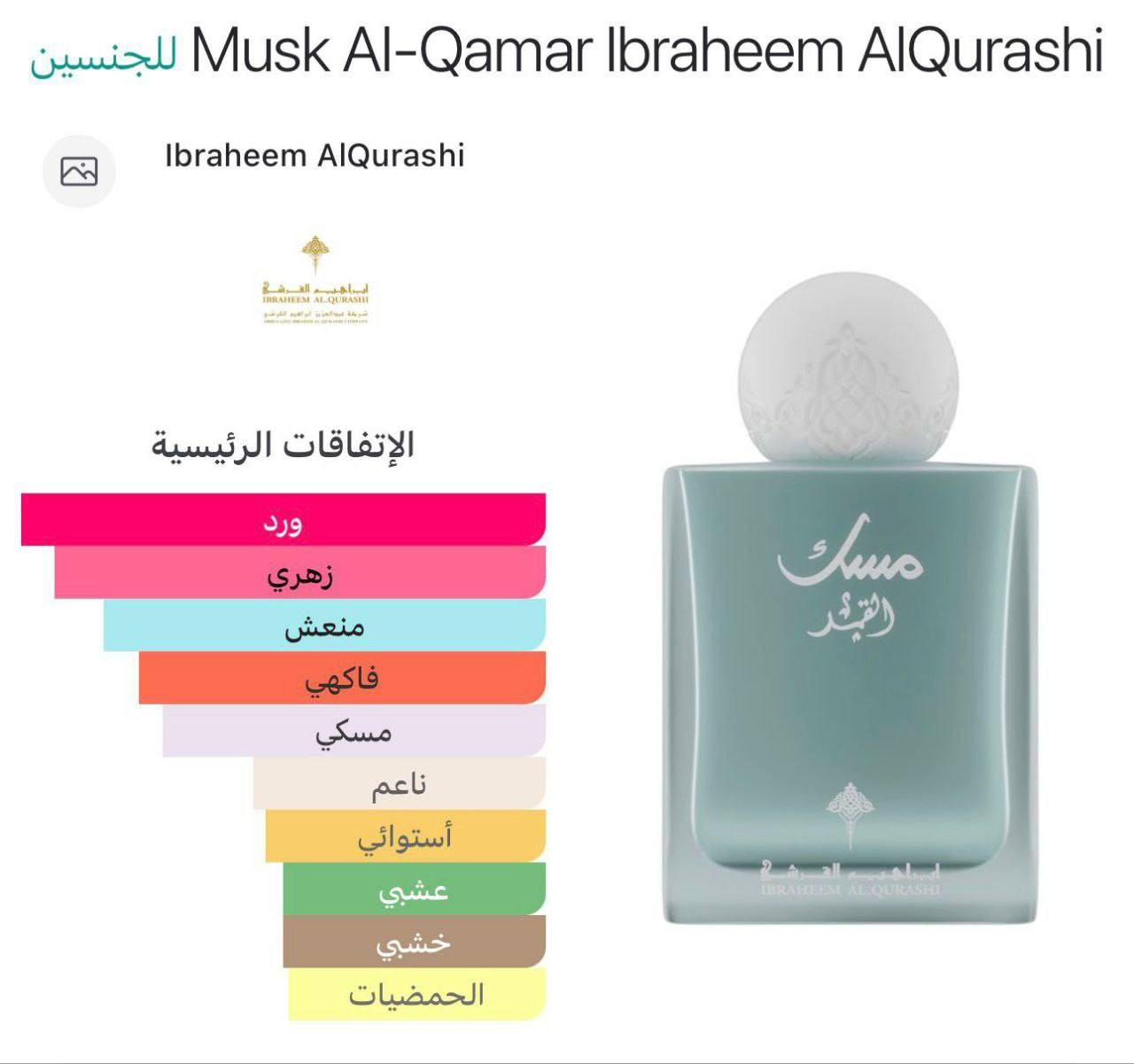 عطر مسك القمر من إبراهيم القرشي هو تجربة عطرية فريدة تمزج بين النعومة والقوة، مما يخلق تجربة غامرة تبقى في الذاكرة.  مكونات العطر: • المقدمة: تبدأ بنفحات فاكهة الليتشي المنعشة، مع دفء البرغموت وجوزة الطيب، مما يمنح بداية مفعمة بالحيوية. • القلب: يتألق بالورد التركي الناعم، مع رقي المسك ودفء الفانيليا، ليضفي لمسة من الرومانسية الحالمة. • القاعدة: تتكون من الكشميران، البخور، وخشب الأرز، لتترك أثرًا خالدًا يعبر عن قوة الشخصية **إذا كنت صاحب هذا الإعلان وتريد حذفه لأي سبب، رجاءا أرسل رسالة إلى الدعم الفني**