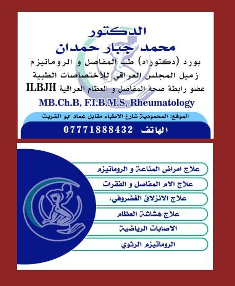 السلام عليكم تعلن عياده الدكتور محمد جبار أخصائي المفاصل بمناسبة شهر رمضان وافتتاحيه العياده كشفيه مجانا الفحص مجانا #مجانا يوم الأربعاء المصادف 18\2\2026 يوم الاحد المصادف 22\2\2026 يوم الثلاثاء المصادف 24\2\2026 يوم الأربعاء المصادف 25\2\2026 الموقع المحمودية شارع الاطباء مقابل عماد ابو الشربت الهاتف - ***********