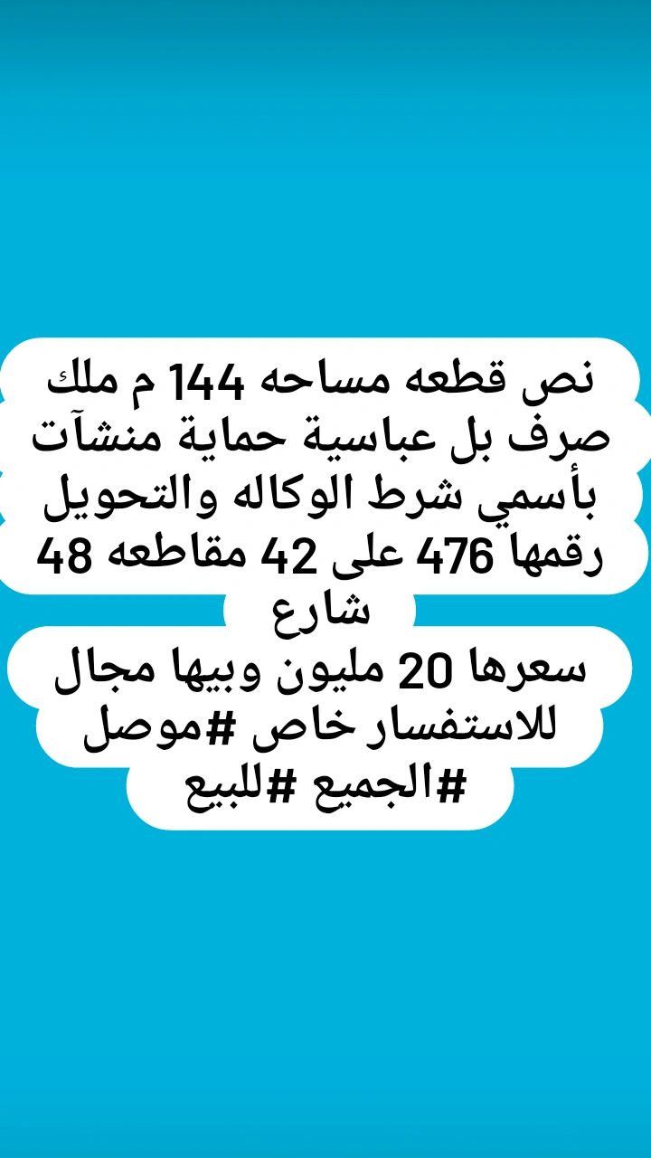 نص قطعه مساحه 144 م ملك صرف بل عباسية حماية منشآت بأسمي شرط الوكاله والتحويل رقمها 476 على 42 مقاطعه 48 شارع سعرها 20 مليون وبيها مجال للاستفسار خاص #موصل #الجميع #للبيع **إذا كنت صاحب هذا الإعلان وتريد حذفه لأي سبب، رجاءا أرسل رسالة إلى الدعم الفني**