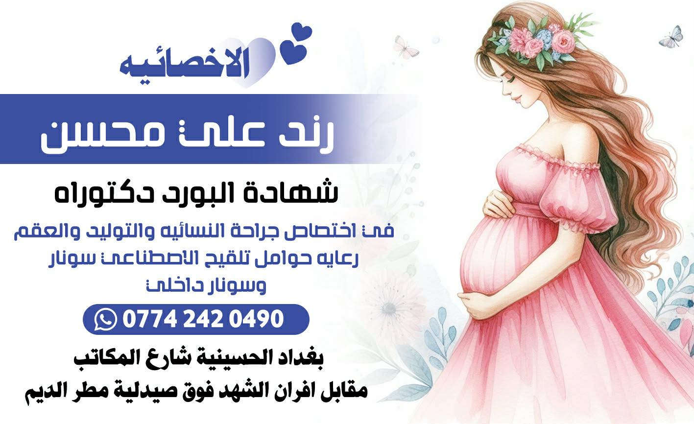 الدكتورة الاخصائيه رند علي محسن شهاده البورد دكتوراه في اختصاص جراحه النسائيه والتوليد والعقم رعايه حوامل - تلقيح الاصطناعي - سونار -سونار داخلي رقم الحجز *********** شارع المكاتب قرب العماره الحمراء مقابل افران الشهد فوق صيدليه مطر الديم