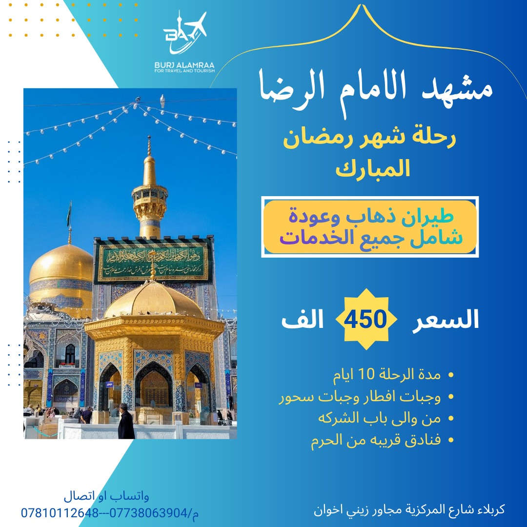 📣 برج الأمراء تقدم لكم 🌙✨ رحلة خاصة في شهر رمضان المبارك 🌙 إلى مشهد الإمام الرضا عليه السلام ✨🌙 هل تحلم بقضاء 10 أيام إيمانية في أجواء روحانية قريبة من الحرم؟ هذه فرصتك لتعيش رمضان بطعم مختلف في مدينة مشهد 🇮🇷 🗓️ مدة الرحلة: 10 أيام كاملة ✈️ طيران مباشر ذهابًا وإيابًا 🏨 فندق قريب جدًا من الحرم الشريف 🕌 (راحة وسهولة في الزيارة) 🍽️ وجبات إفطار وسحور يوميًا 🛄 تنظيم متكامل وإقامة مريحة 💰💰💰السعر: 450 الف فقط💰💰 🌟 لماذا تختار هذا العرض؟ لأنك ستكون على بُعد خطوات من الحرم الشريف طوال إقامتك،ولتعيش أجواء ليالي رمضان المباركة بالقرب من الإمام الرضا عليه السلام. 📱 للحجز والاستفسار:واتساب او اتصال م/***********---*********** م/*********** 📍 شركة برج الأمراء للسفر والسياحة كربلاء شارع المركزية مجاور زيني اخوان رمضان هذه السنة… مختلف ✨ اجعل زيارتك أسهل… وسفرتك أريح… وسعرك أوفر.