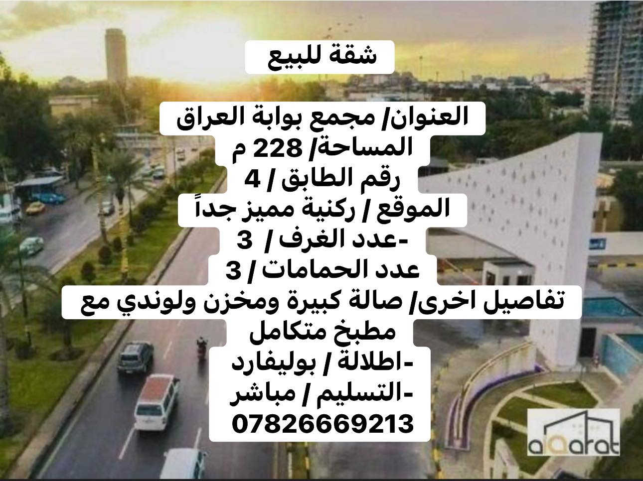شقة للبيع العنوان/ مجمع بوابة العراق المساحة/ 228 م رقم الطابق / 4 الموقع / ركنية مميز جداً -عدد الغرف / 3 عدد الحمامات / 3 تفاصيل اخرى/ صالة كبيرة ومخزن ولوندي مع مطبخ متكامل -اطلالة / بوليفارد