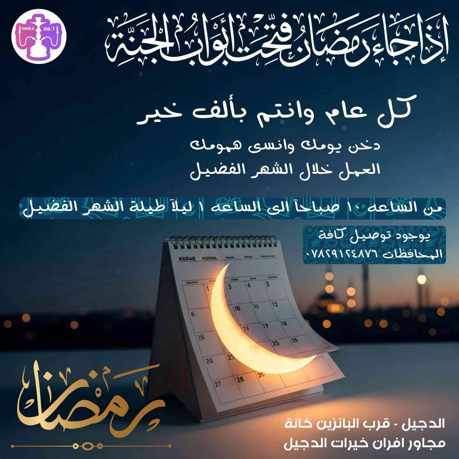 صباحكم الله بالخير والرحمات مكتب Smoke no.1 للاراكيل والمعسلات يهنئكم بحلول شهر رمضان المبارك ونعلن عن توجدنا خلال الشهر الفضيل من الساعه 10صباحا إلى الساعه 1 ليلا نعمل من أجل اسعادكم 🥰 انتظروا العروض رمضانيه 🚨 الدجيل بالقرب من البانزنخانه مجاور افران خيرات الدجيل يوجد لدينا توصيل لكافه أنحاء العراق *********** انستغرام smok_eno1 واهلا وسهلا بكم