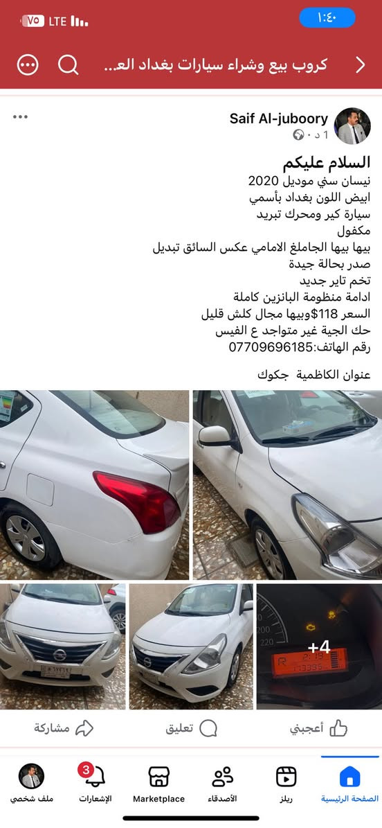 نيسان سني موديل 2020 ابيض اللون بغداد بأسمي سيارة كير ومحرك تبريد مكفول بيها بيها الجاملغ الامامي عكس السائق تبديل صدر بحالة جيدة تخم تاير جديد ادامة منظومة البانزين كاملة السعر 118$وبيها مجال كلش قليل حك الجية غير متواجد ع الفيس رقم الهاتف:*********** عنوان الكاظمية جكوك
